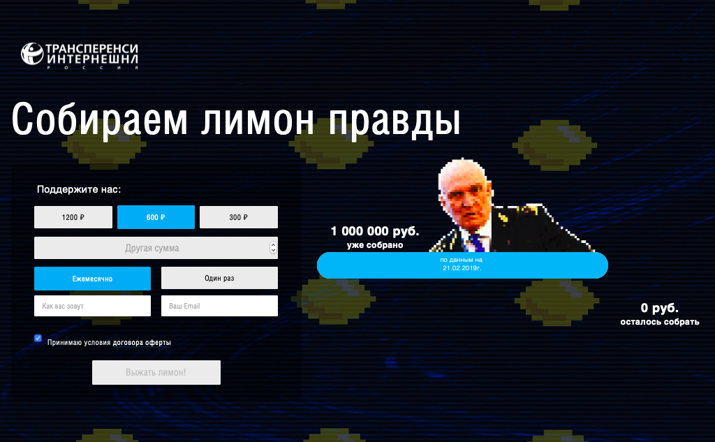Организация начала сбор средств в октябре 2018 года. «Один миллион стоит наше с вами право говорить правду, поэтому мы так его и прозвали – лимон правды», – написали представители «Трансперенси Интернешнл» в социальных сетях. Призыв оказался успешным, и за месяц необходимая сумма была собрана.