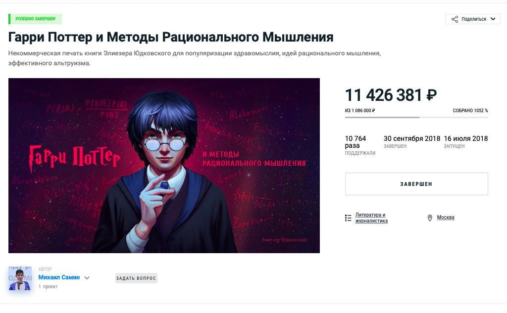 Самая громкая крауд-кампания прошлого года на платформе Planeta.ru – это некоммерческая печать книги Элиезера Юдковского «Гарри Поттер и методы рационального мышления». Проект на один день даже стал самым успешным в истории российского краудфандинга, ему удалось собрать больше 11,4 млн рублей.