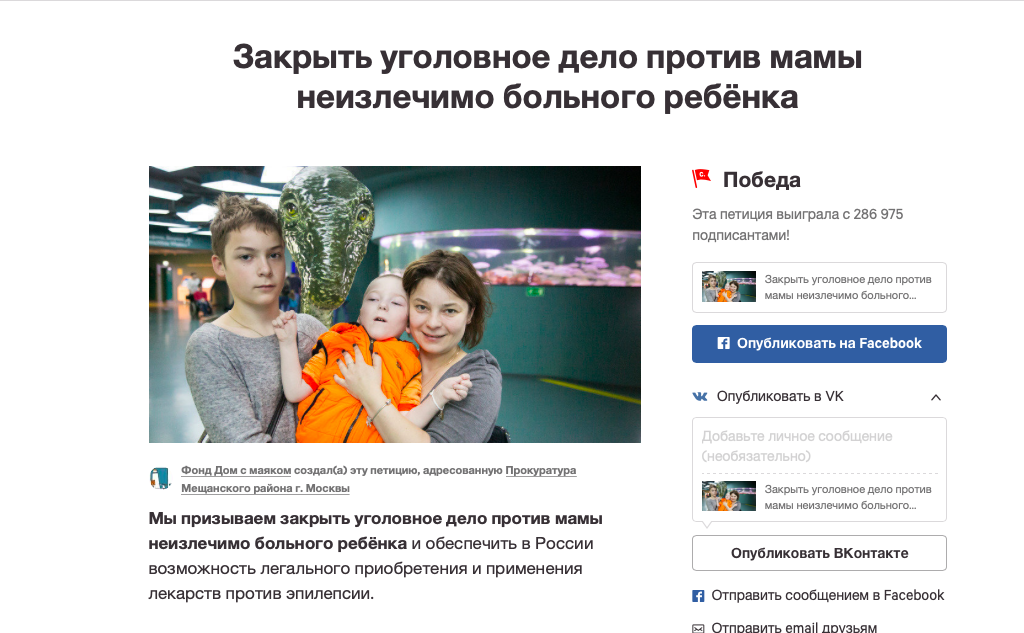 Хоспис «Дом с маяком» запустил петицию в защиту женщины на платформе Change.org. С поддержкой Екатерины Конновой также выступили другие благотворительные организации и чиновники. Петицию подписало более 286 тысяч человек. Дело было официально закрыто. Сотрудники «Дома с маяком» надеются, что эта история приведет к другой победе – изменению законодательства и регистрации на территории России лекарств, которые сейчас родители покупают незаконно.