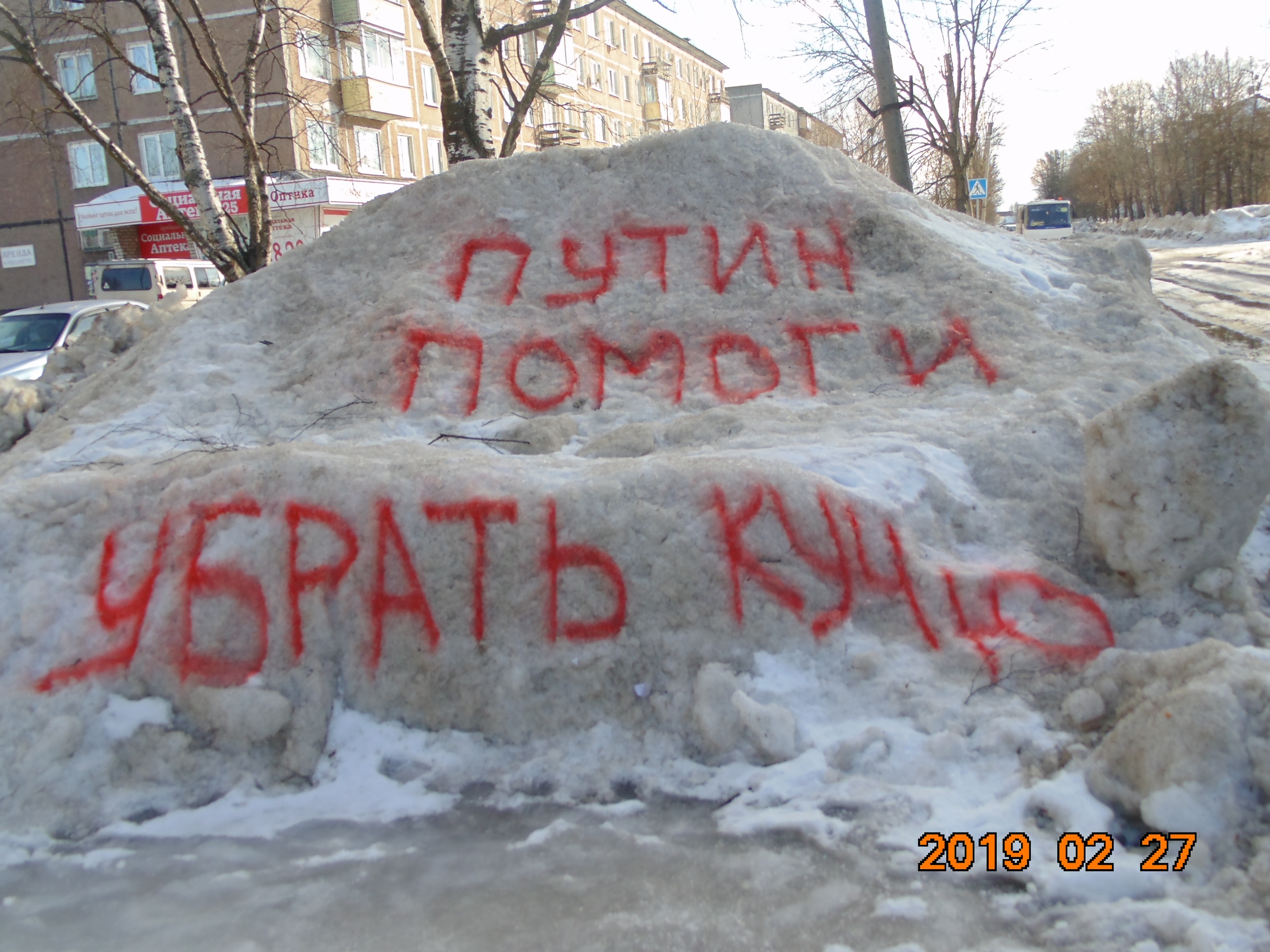 В Карелии чиновники администрации Олонецкого района обратились в полицию с требованием проверить местного депутата Игоря Некина, который написал «Путин помоги убрать кучю» (орфография и пунктуация автора сохранены) на сугробе. Об этом в своей группе «ВКонтакте» написал сам депутат, а также издание «Руна» со ссылкой на администрацию.