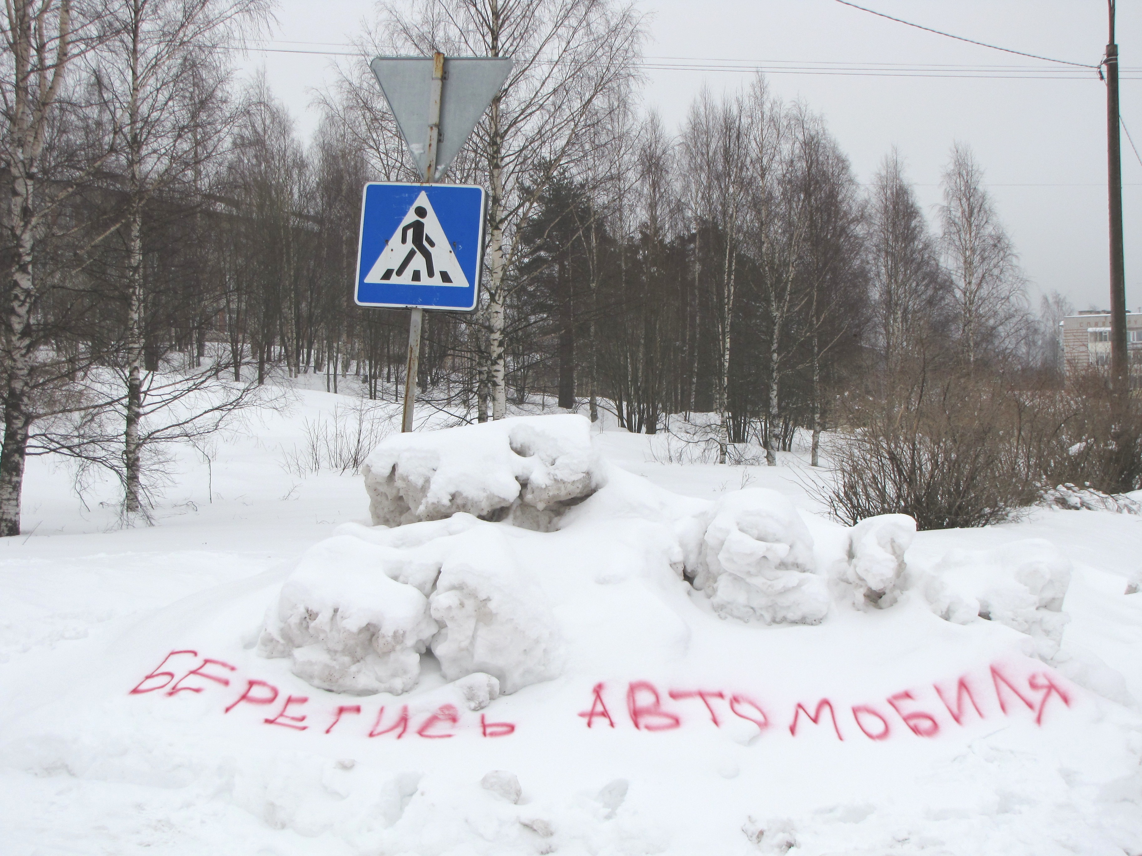 "Они" в терминологии жителей – это чиновники, по вине которых город завален снегом. По центральной площади между мэрией и закрытым Домом культуры не пройти – ноги увязают в снегу. Центральная улица (как водится, имени Ленина) по качеству уборки напоминает деревенскую. На перекрестках – сугробы, полностью перекрывающие обзор как пешеходам, так и водителям. Переходы опасны для жизни, о чем Анна Бойкова предупреждает земляков с помощью баллончика с краской. "Берегись автомобиля!" – пишет активистка на сугробе.