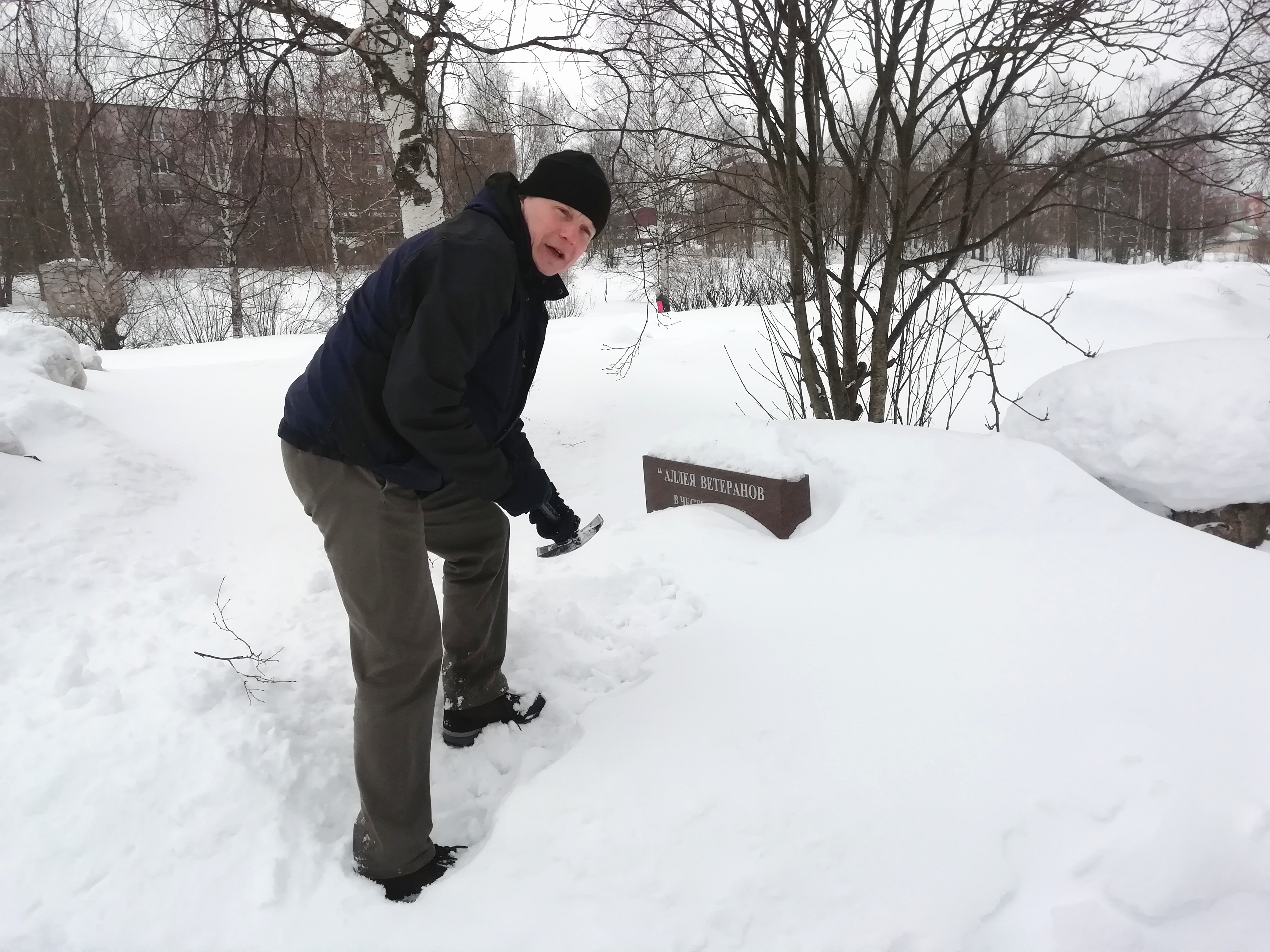 Рядом с нею предприниматель Николай Кушанов откапывает мемориальный камень, установленный в начале Аллеи ветеранов. Надпись на камне тоже завалена снегом.
