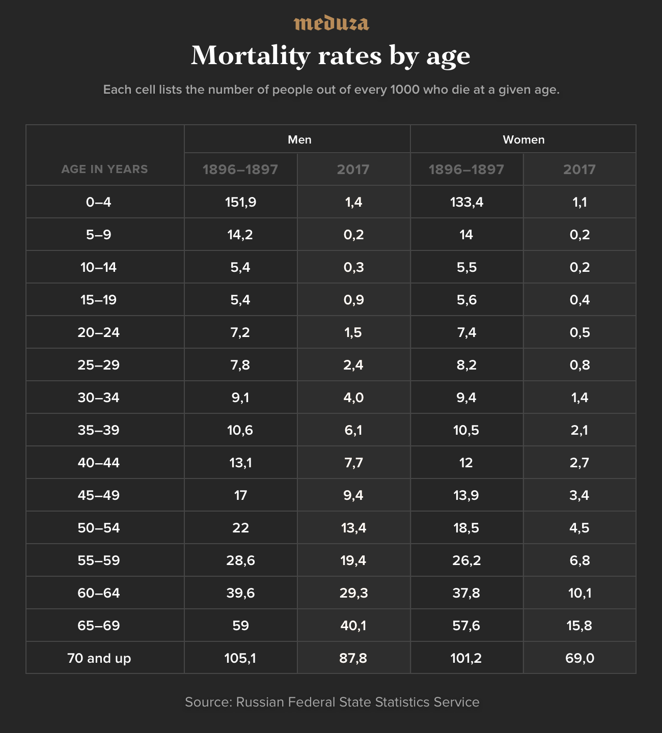 Since the first general Russian census in 1897, the life expectancy of Russian citizens has doubled. This trend is tied primarily to a decrease in child and infant mortality (by 80 and 32 times respectively). BadComedian is certainly right on that count, but that is not a complete picture of what is happening in Russian demographics.