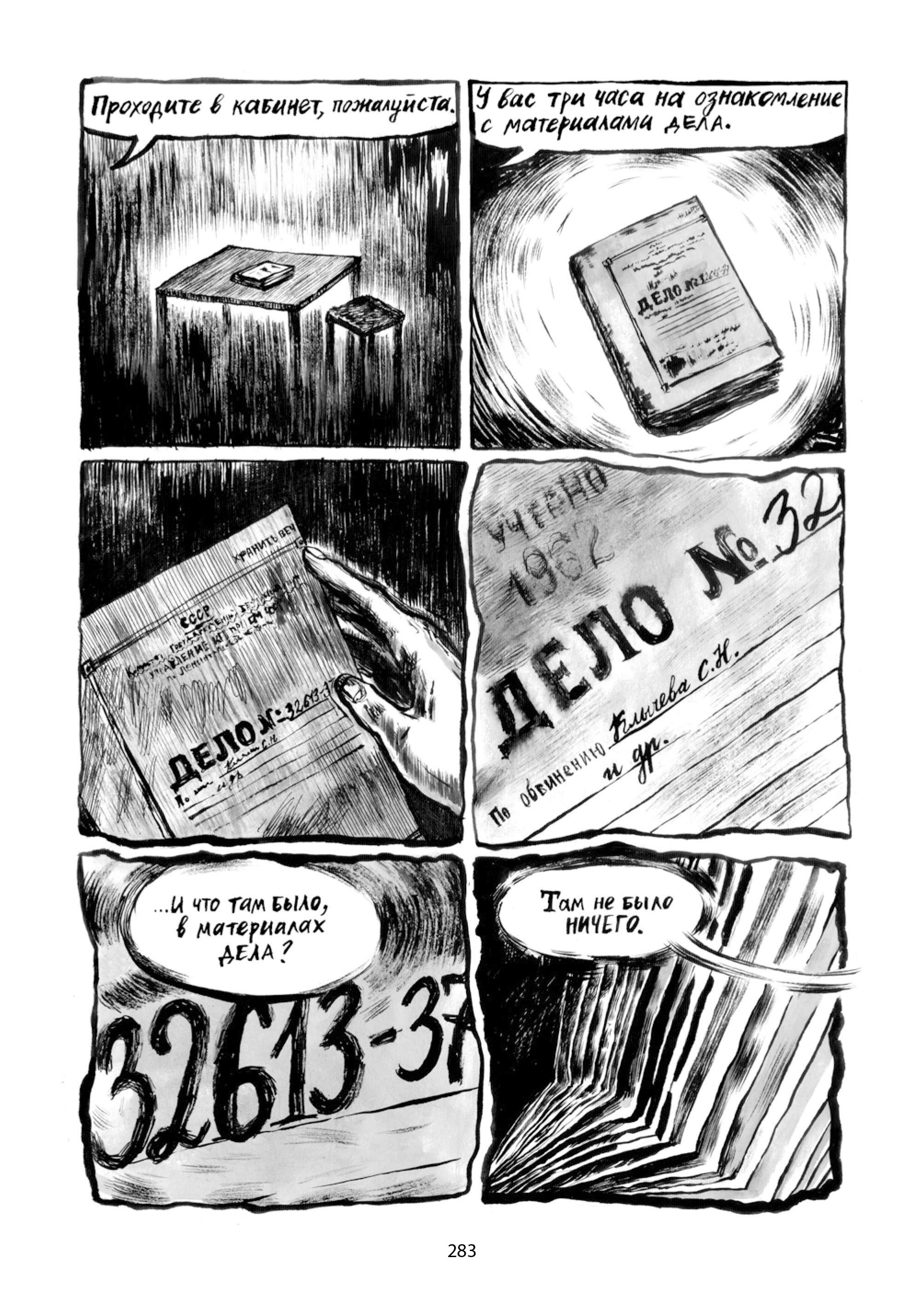 Придя в архив ФСБ, я перерисовала всё в блокнот: некоторые детали, связанные с другими людьми, расстрелянными по тому же делу, были прикрыты [бумажными листами со скрепками]. Позже мне выслали ксерокопию. Когда я увидела еще больше [скрытых мест], усмехнулась. И порадовалась своей интуиции. Не зря я всё переписала! Обложку дела — картонную, пожелтевшую, с печатью «рассекречено» — я нарисовала в книге.