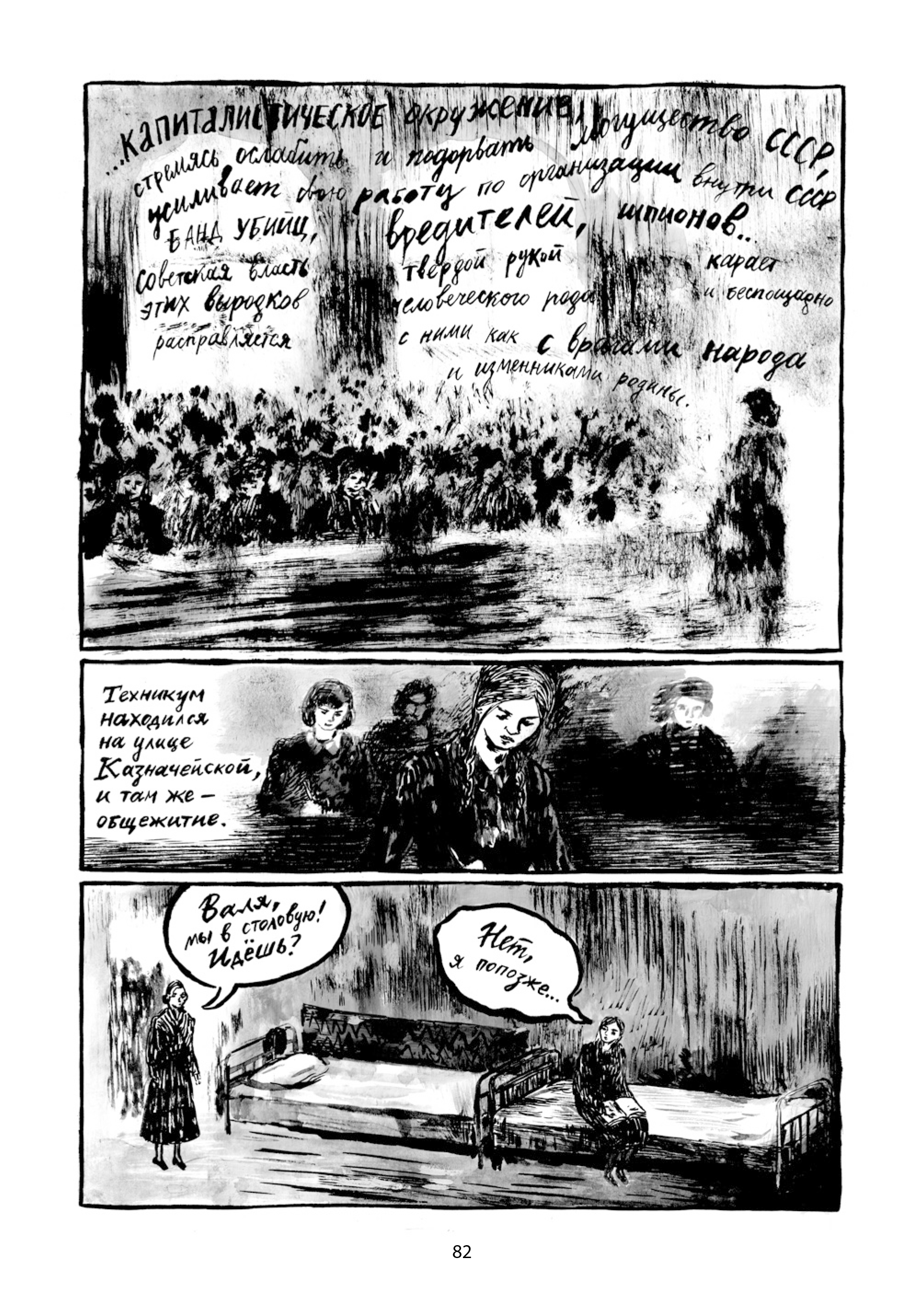 — Над каждым из четырех своих комиксов я работала по несколько лет (Ольга также автор книг «Процесс двенадцати» о суде над активистами «Другой России», «Непризнанное государство» о попытках создать микрогосударство в современном мире и детектива «Шув» о взрослении на фоне событий 90-х — прим. «Бумаги»). Долго обдумывала тему, постепенно собирала материалы. Работу я начинала с записей в блокноте и подборок картинок из интернета. Наверное, к четвертой книге у меня уже появилось достаточно опыта, чтобы взяться за такую большую тему.
