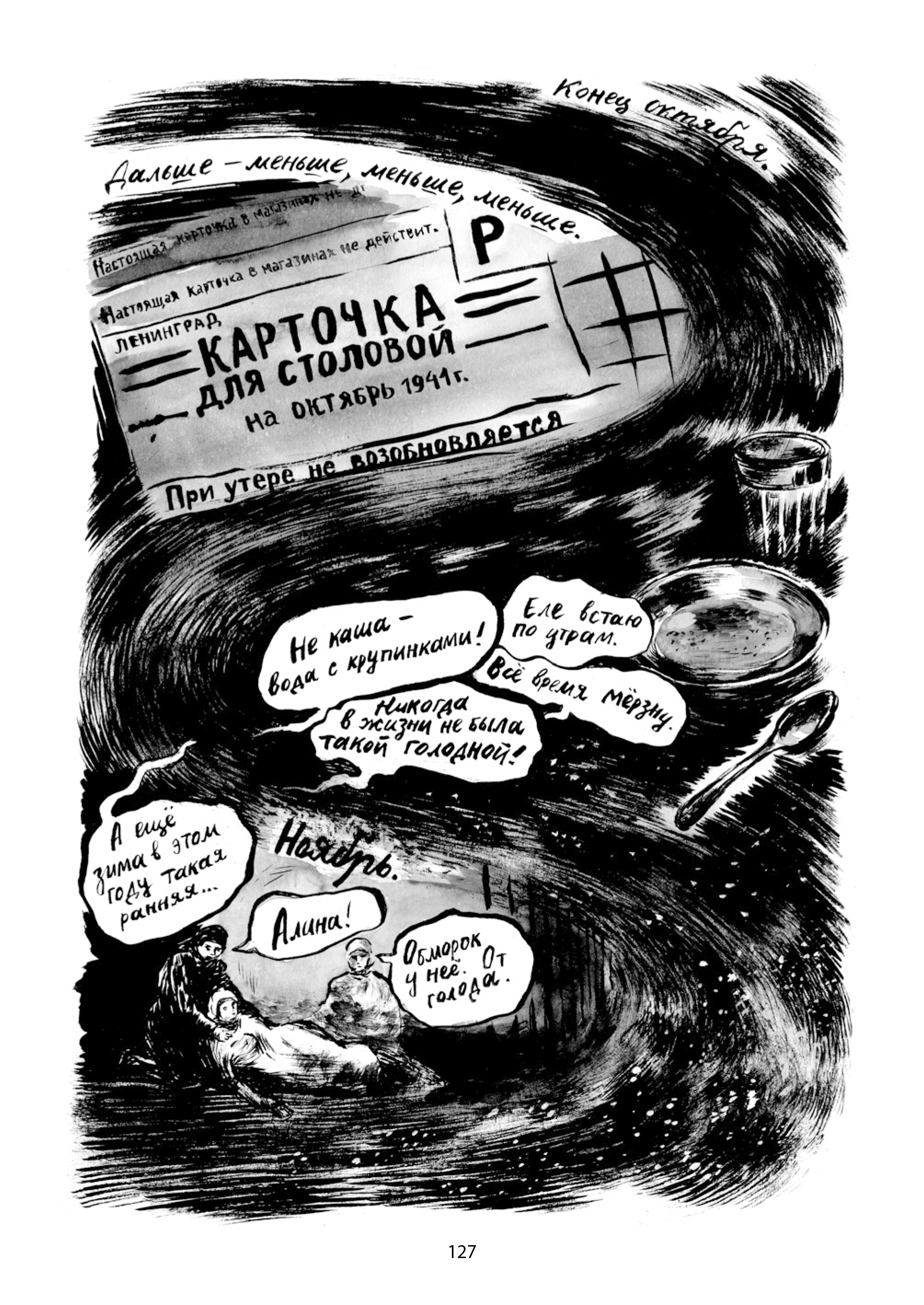 Сценарий я несколько раз переписывала, не зная, как вместить в одну книгу две большие темы — репрессии и блокаду. В итоге получилась традиционная структура — рассказ о событиях в хронологическом порядке. На сами рисунки ушло еще где-то полтора года.