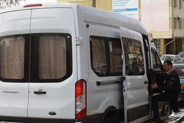 Около здания стоит микроавтобус без символики правоохранительных органов. На его переднем сидении заметны папки и ящики с наклейкой «Горводоканал».