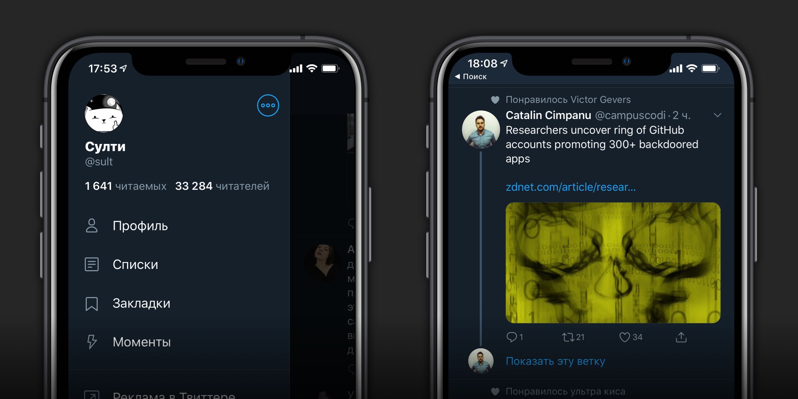 В мобильных приложениях Twitter переключение на темную тему устроено куда проще. Надо просто сначала нажать на свой аватар в верхнем левом углу приложения (так откроется экран с настройками), а затем — на иконку полумесяца в нижнем левом углу.