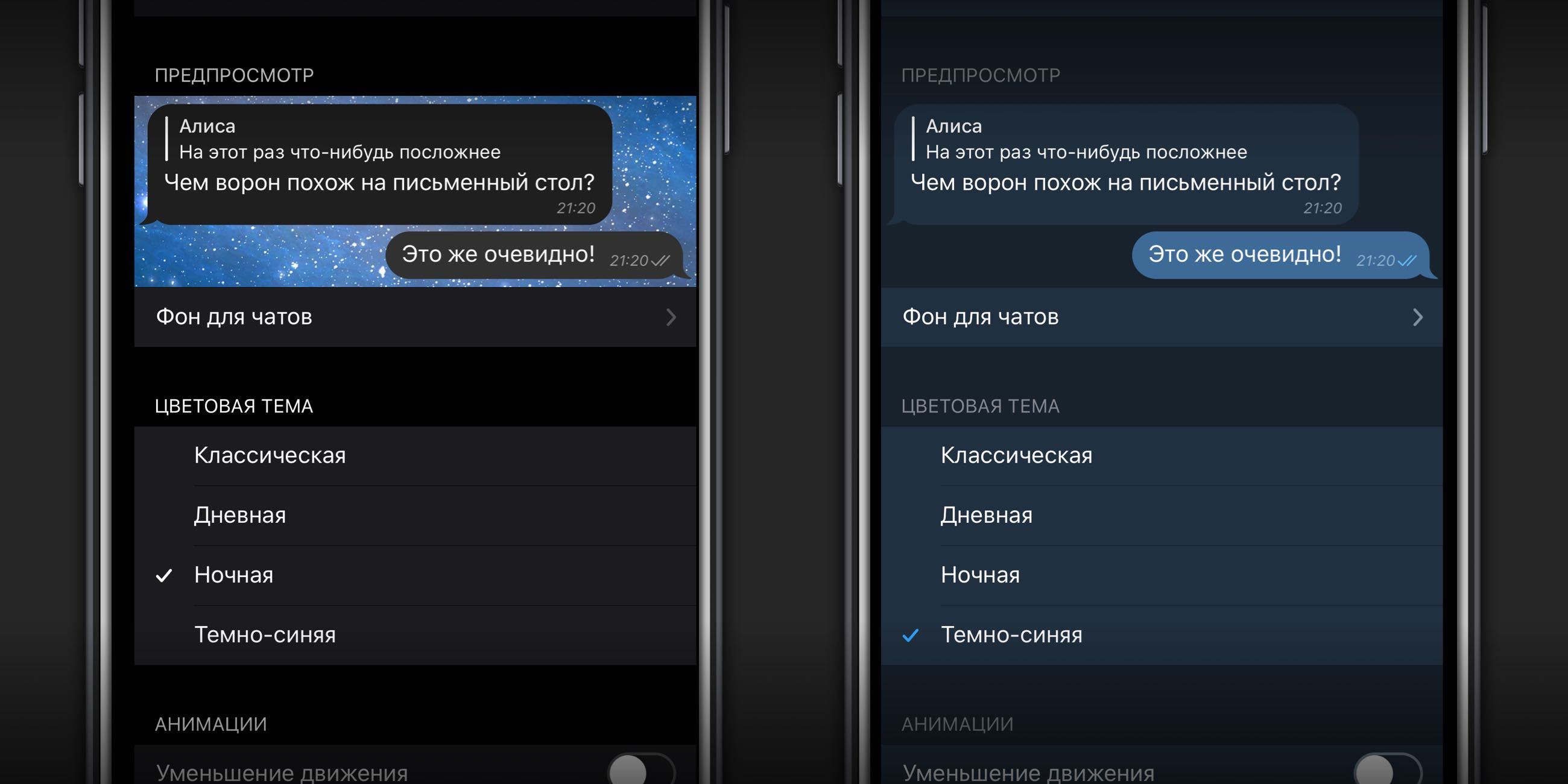 Мессенджер Telegram предлагает сразу четыре темы оформления — две светлые («Классическая» и «Дневная») и две темные («Ночная» и «Темно-синяя»). Найти их можно в настройках приложения — надо зайти в меню «Оформление».