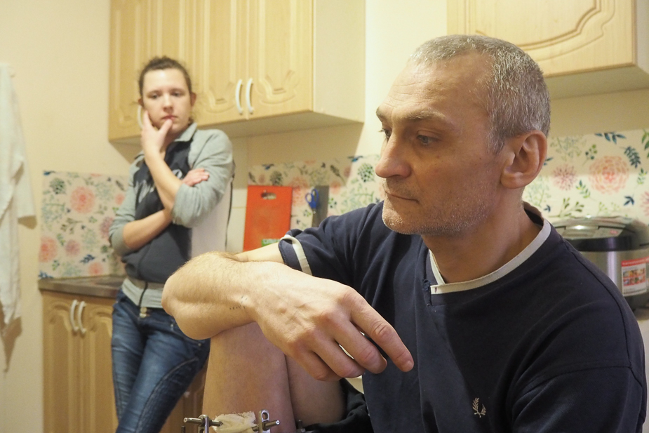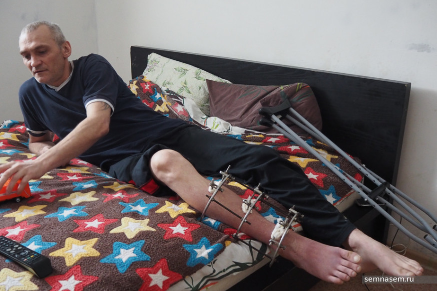На Рождество, 7 января этого года Олег пошел в магазин в соседнем доме, поскользнулся на покрытом ледяными буграми тротуаре на улице Молодцова и сломал ногу. Врачи БСМП сделали ему две операции и установили на ногу аппарат Илизарова — компрессионно-дистракционное устройство — металлические шурупы и штыри, которые фиксируют обломки кости в ноге. Олегу Третяку предстоит носить его несколько месяцев. Как лечиться дальше, он не знает — у семьи нет средств даже на обезболивающие. Нет и полиса обязательного медицинского страхования (ОМС), потому что Олег до сих пор — гражданин Украины. Подать документы на российское гражданство Третяки тоже не могут, так как у них нет прописки, даже временной.