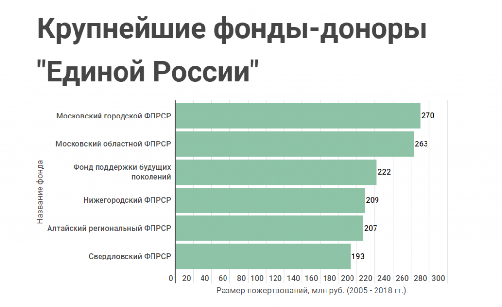 С 2005 года «Единая Россия» получила через 79 фондов 8,1 млрд руб. Больше всего поступило таких пожертвований через Московский городской (270 млн), Московский областной (263 млн), Нижегородский (209 млн), Алтайский (207 млн) и Свердловский (193 млн) фонды. «Фонд поддержки будущих поколений» пожертвовал 222 млн руб.