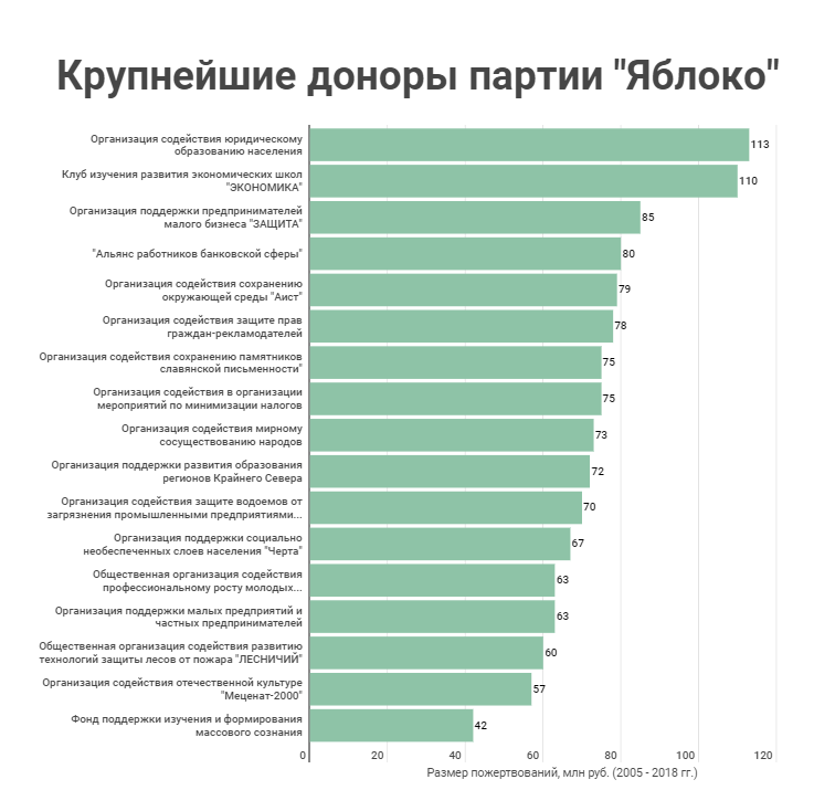 Так, партия «Яблоко» получила значительные пожертвования от 17 общественных организаций и фондов. В общей сложности партия получила от таких структур 1,2 млрд руб. пожертвований на свою деятельность и еще 239 млн руб. — на ведение кампаний.