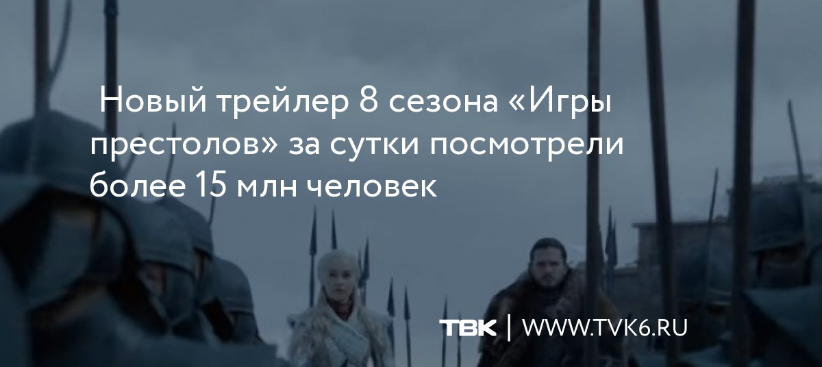 Телеканал HBO опубликовал официальный трейлер последнего сезона «Игры престолов». В нем герои готовятся к решающей битве с Королем Ночи и его армией мертвых. Сообщается, что в восьмом сезоне будет 6 серий.