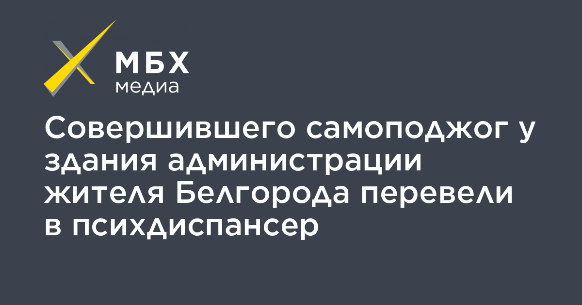 Жителя Белгорода Владимира Смолякова, который совершил самоподжог у здания областной администрации, перевели в психдиспансер. Об этом корреспонденту «МБХ медиа» рассказали в ожоговом центре.