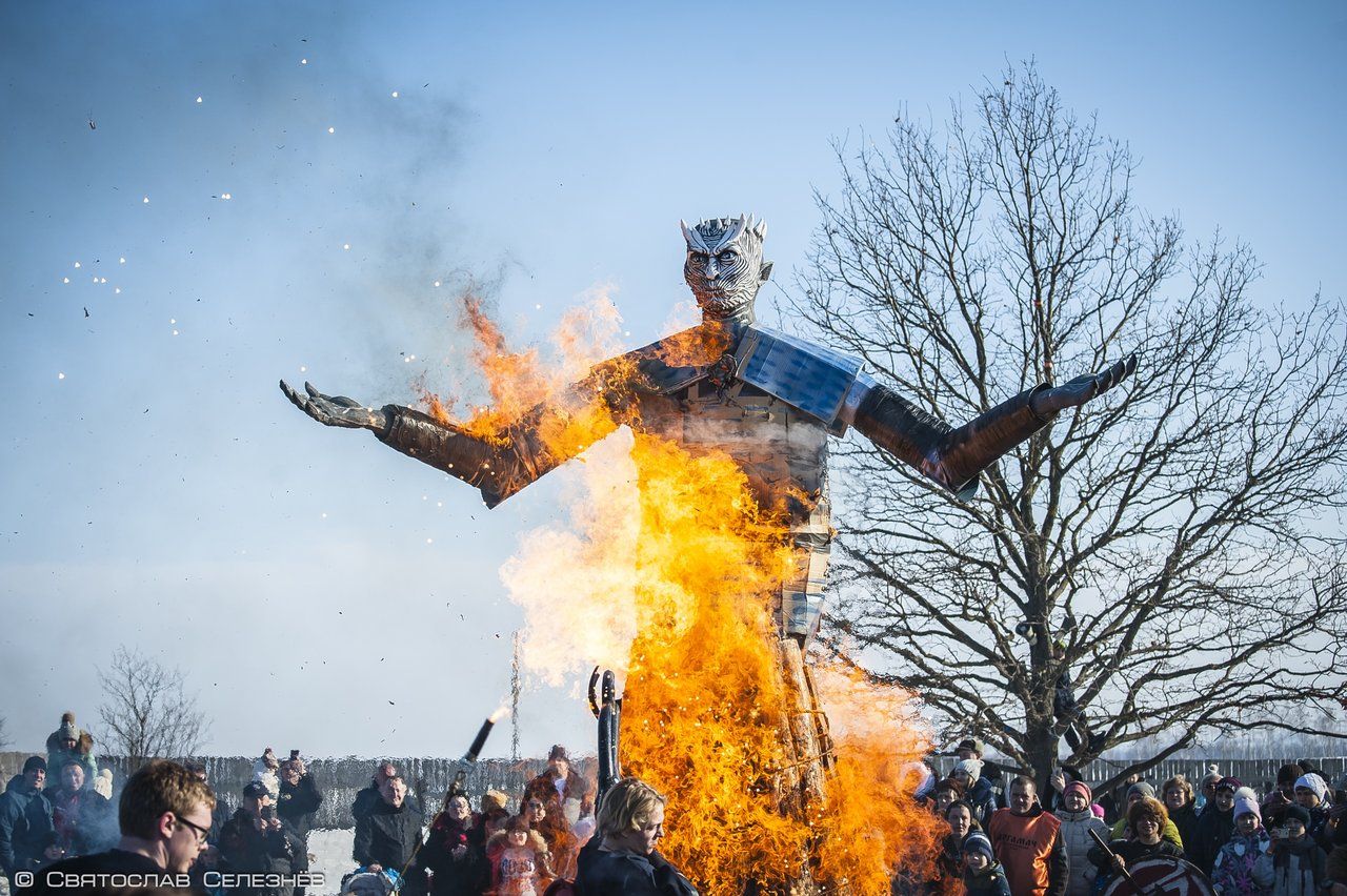 In Argamach Archeological Park, located in western Russia’s Lipetskaya Oblast, that doll took the form of the Night King, a prominent character in the Game of Thrones series. Photographs of its celebratory burning were posted on the social site Pikabu and the image service Imgur, where they were also spotted by English-speaking users.