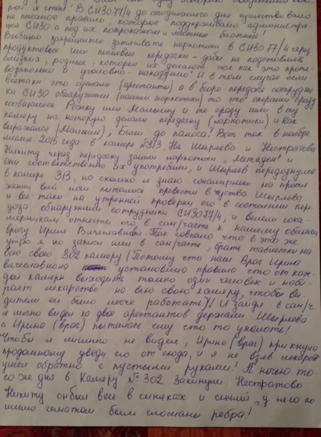 А ночью того же дня в камеру № 302 закинули Нистратова Никиту. Он был весь в синяках, у него помимо гематом были сломаны ребра. На мой вопрос, что случилось, Никита рассказал всю эту историю про себя и Ширяева и добавил, что Ирина, медсестра, все-таки привела в себя Ширяева, и его увели обратно в 313-ю камеру. А вот вечером туда зашли Малыш и Рожок и стали избивать Никиту и Ширяева. Малыш избил Ширяева до такой степени, что Ширяева увезли в больницу. Как я узнал через несколько дней у оперативника Гриши Сморкалова, Ширяева доставили в больницу, сделали трепанацию черепа, но от нанесенных ему травм он скончался. И это, поверьте, не единственный случай в СИЗО-4! Сейчас в ГСУ СК по СВАО Москвы в Бабушкинском отделе возбуждено уголовное дело по убийству Ширяева. Никита Нистратов является жизненно важным свидетелем убийства. А Сергей (Малыш), находясь в СИЗО Зеленограда, оттуда по мобильной связи пытается совместно с Рожком запугать или убрать свидетелей убийства и остальных своих преступлений».