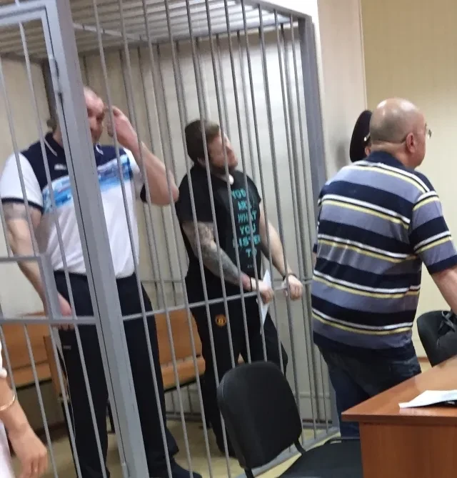 Сергей Щипанцев в суде (слева, за решеткой), справа Александр Афанасьев (Афоня)