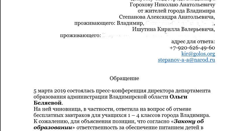 Ни в коей мере не хотим оправдывать тех детей, что кидаются в школьных столовых хлебом, но убеждены, что это не имеет никакого отношения к вопросу, который тогда рассматривали депутаты. Речь шла либо о сохранении завтраков для всех, либо нет. Отметим, что сам Горохов не гнушается пользоваться правом бесплатного проезда в городском общественном транспорте и получает, как Почетный гражданин, ежемесячную выплату из бюджета. Убеждены, что слова Горохова оскорбляют большую часть прилежных владимирских детей и их родителей. Отметим, что ранее, после оглашения результатов выборов губернатора Владимирской области, он в интервью журналистам телеканала «Дождь» охарактеризовал жителей региона как «неблагодарных». Уверены, что человек, позволяющий себе такие высказывания о владимирцах и их детях, порочит звание «Почетного гражданина». Поскольку в положении о звании «Почетный гражданин Владимирской области» есть указание, что носитель может быть лишен его «за совершение действий, порочащих это почетное звание», а вопрос этот относится к ведению Законодательного Собрания, просим Вас поставить вопрос о лишении Николая Горохова звания «Почётный гражданин Владимирской области». Кроме этого, просим губернатора Сипягина, Законодательное Собрание, администрацию и Совет народных депутатов города Владимира вернуться к рассмотрению вопроса о выделении денежных средств на бесплатные завтраки для всех младшеклассников города. Просим всех вышеупомянутых адресатов рассмотреть обращение в порядке, предусмотренном ФЗ «О порядке рассмотрения обращений граждан Российской Федерации» от 02.05.2006 №59-ФЗ и прислать ответ на указанные адреса электронной почты.