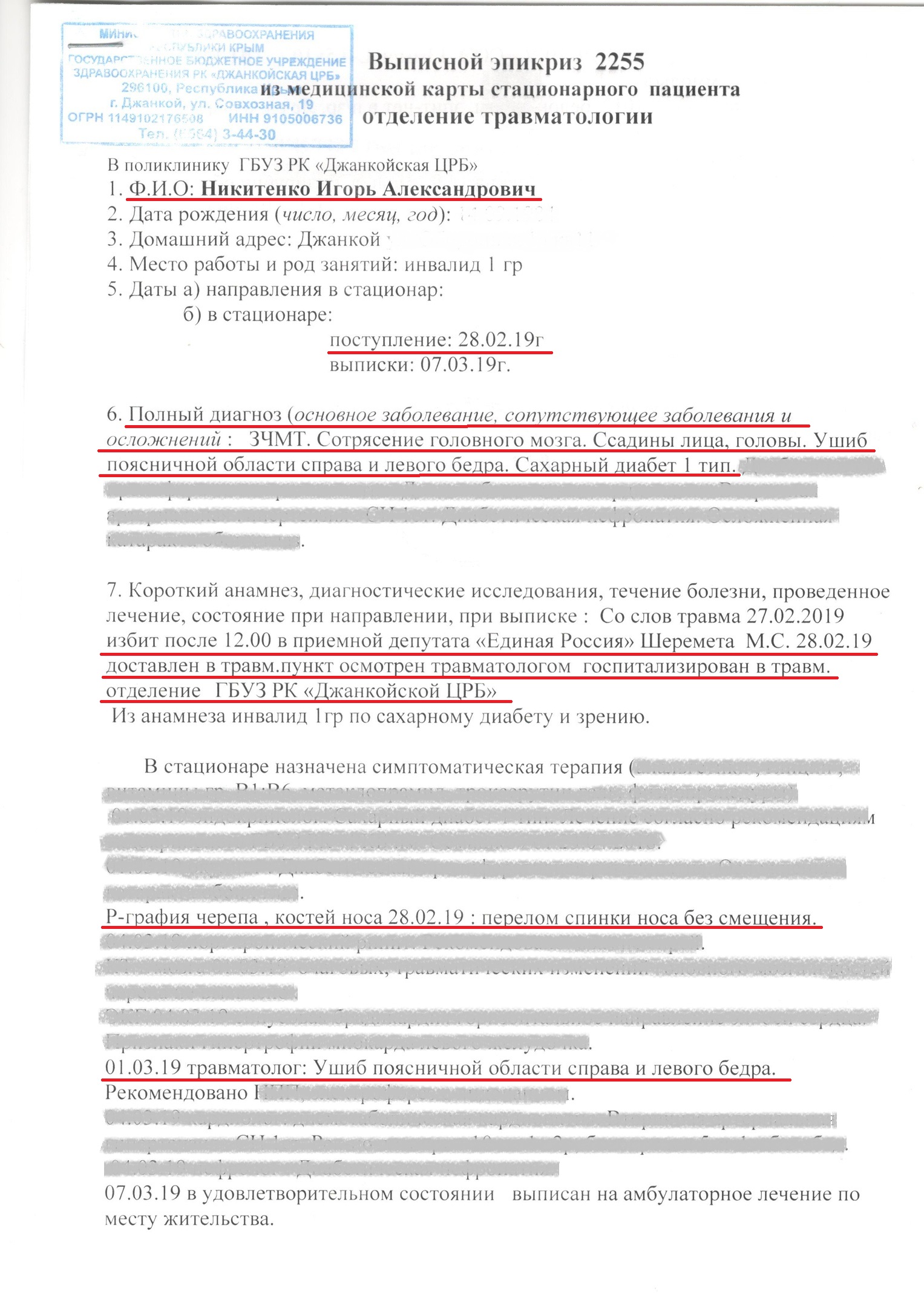 На следующий день после приема у Михаила Шеремета он прошел обследование в отделении травматологии Джанкойской центральной больницы. Согласно выписному эпикризу, который Крым.Реалии предоставил Игорь Никитенко, у него диагностировали закрытую черепно-мозговую травму, сотрясение мозга, ссадины лица, ушиб поясничной области справа и левого бедра, перелом спинки носа без смещения.