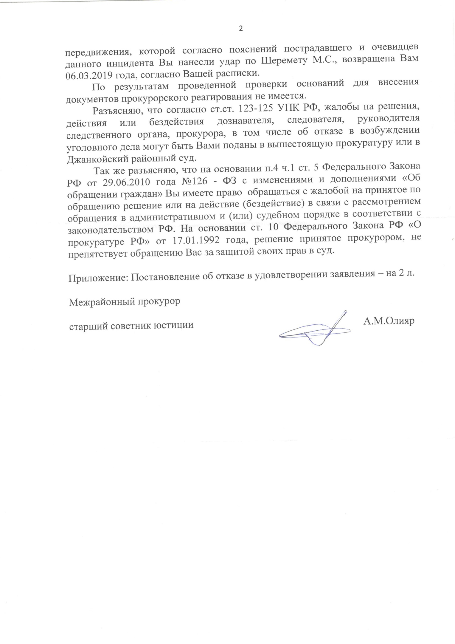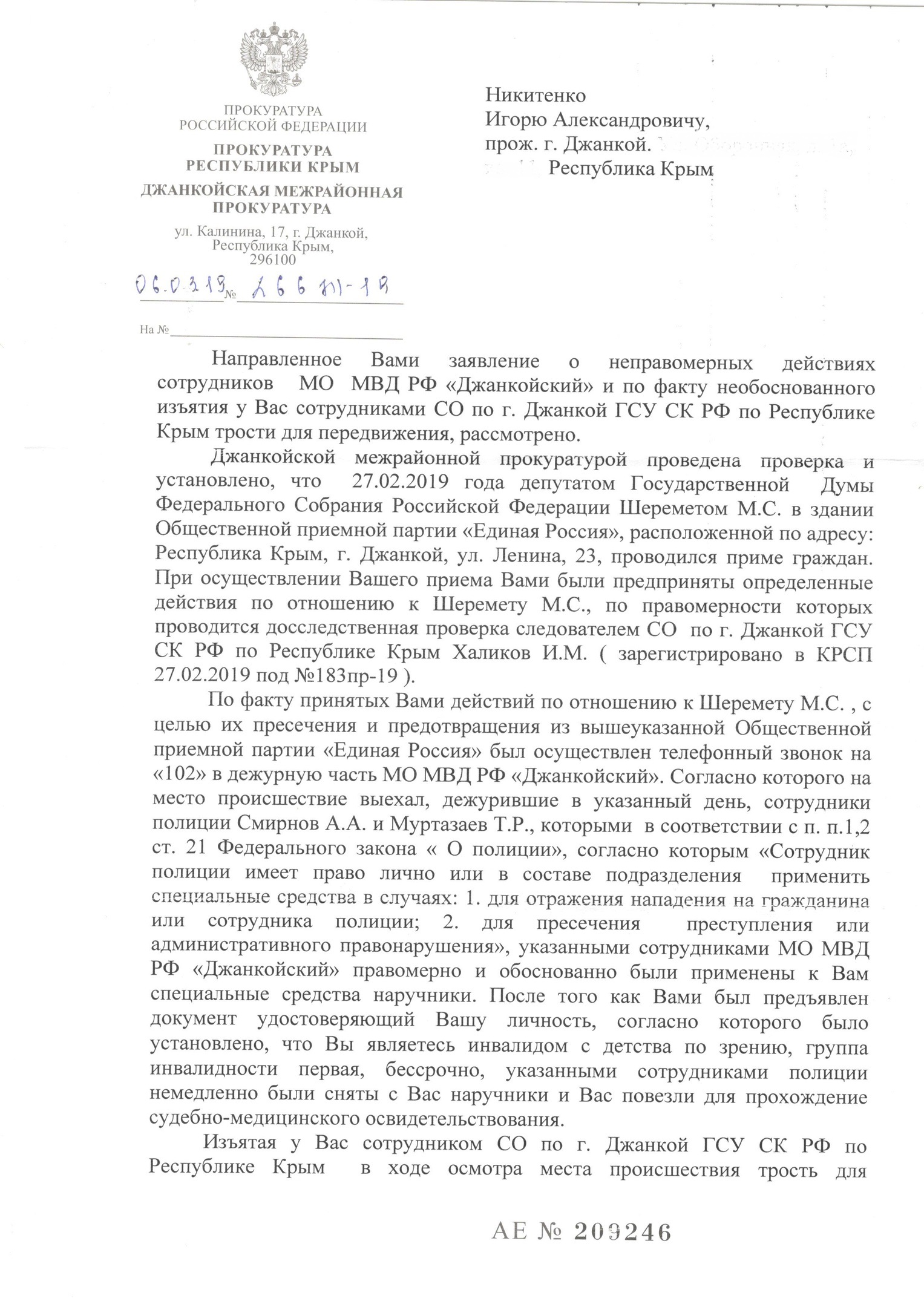 «Сотрудниками МВД правомерно и обоснованно были применены к вам специальные средства – наручники. После того, как вами был предъявлен документ, удостоверяющий вашу личность, согласно которому было установлено, что вы являетесь инвалидом с детства по зрению, сотрудниками полиции немедленно были сняты с вас (наручники – КР) и вас повезли на прохождение судебно-медицинского освидетельствования... Изъятая у вас в ходе осмотра места происшествия трость для передвижения, которой, согласно пояснениям пострадавшего и очевидцев инцидента, вы нанесли удар по Шеремету, возвращена вам 6 марта. По результатам проверки оснований для внесения документов прокурорского реагирования не имеется», – говорится в документе за подписью Олияра, которым располагают Крым.Реалии.