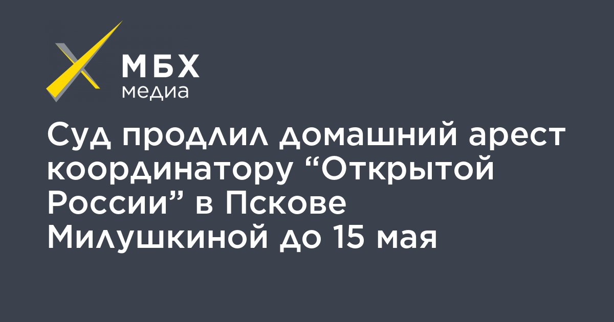 Суд продлил домашний арест координатору “Открытой России” в Пскове Лии Милушкиной, которую обвиняют в сбыте наркотиков, до 15 мая, передает корреспондент “МБХ медиа” из зала суда.