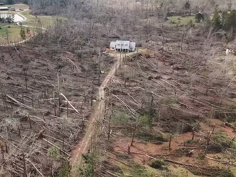 3 марта на город Уэверли-Холл, который находится в округе Харрис американского штата Джорджия, обрушился мощный торнадо, пришедший из штата Алабама. Мэтт Гиллеспи из близлежащего населенного пункта Эллерсли с помощью дрона запечатлел последствия стихии. К своему удивлению, он обнаружил, что один из домов пережил прямой удар торнадо и, судя по видео и фото, остался почти невредимым, хотя вокруг были повалены сотни деревьев, сообщает Stormnews.