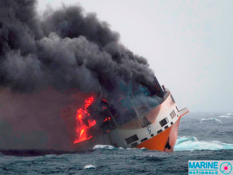 MV Grande America being monitored by @MarineNationale in Bay of Biscay. Still on fire and has developed serious list to starboard