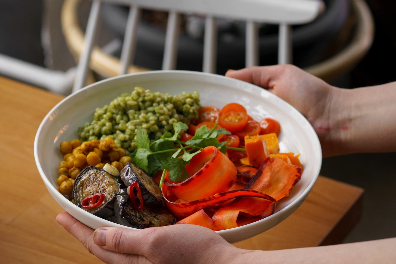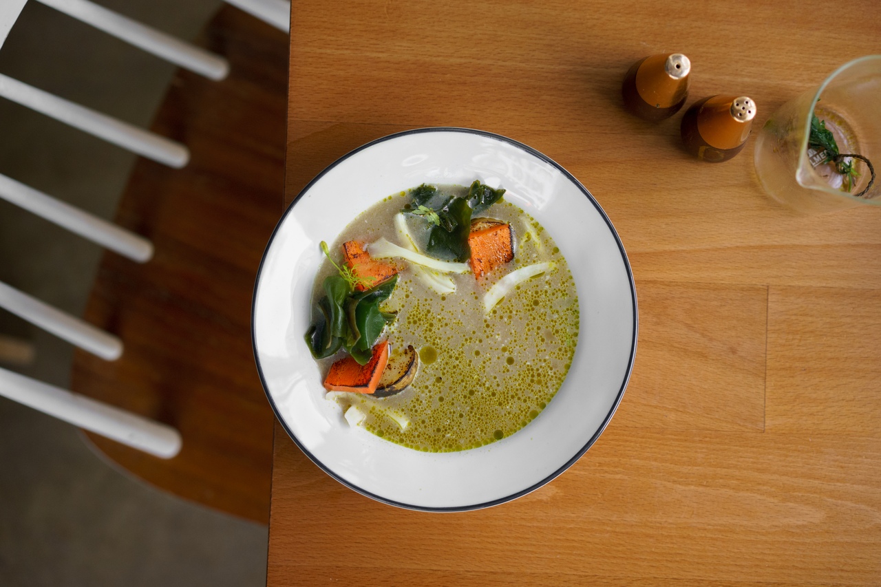 Как рассказал «Бумаге» Сорокин, в заведении три вида меню, еду из которого в самом заведении называют new wave food. Основной акцент первого меню сделан на боулах: с кабачками, полбой, перловкой, киноа или запеченным бататом. Второе меню — с супами и горячим: например, спагетти из полбы с кремом из кешью, шпинатом и шампиньонами, цветная капуста с песто из щавеля и запеченный баклажан с облепихой и чечевицей.