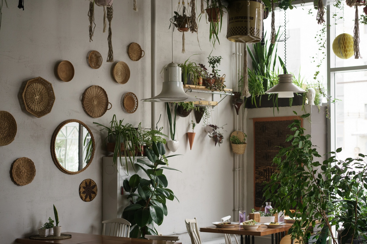 В кафе установлены панорамные окна, висят кашпо с фикусами, а у окна растет банан. Интерьеры выполнены в скандинавском стиле, в заведении установлена мебель из финских антикварных магазинов. Дизайнером проекта была Мария Тюряева.