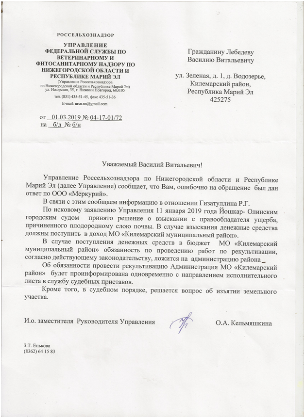 В ноябре 2018 года я получил официальный ответ от заместителя Волжского межрегионального природоохранного прокурора В.Л. Сегизекова, который сообщил, что Управлением Россельхознадзора по Нижегородской области и Республике Марий Эл в июле 2017 года выявлены нарушения, выразившиеся в невыполнении гражданином Гизатуллиным Р.Г (сопредседатель ОНФ в Марий Эл) установленных требований и обязательных мероприятий по улучшению, защите земель и охране почв от ветровой, водной эрозии и предотвращению других процессов и иного негативного воздействия на окружающую среду, ухудшающих качественной состояние земель.