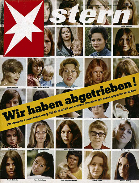 Солидарность также очень важна [в женском движении]. В 1971 году тема аборта в Германии стала своего рода триггером, который привел к развитию женского движения. Тогда во Франции прошла акция «Манифест трехсот сорока трех», после которой немецкий журнал Stern запустил проект под названием «Мы сделали аборт». Несколько десятков женщин, многие из которых были известными деятельницами и актрисами, дали интервью и рассказали о том, что делали аборт.