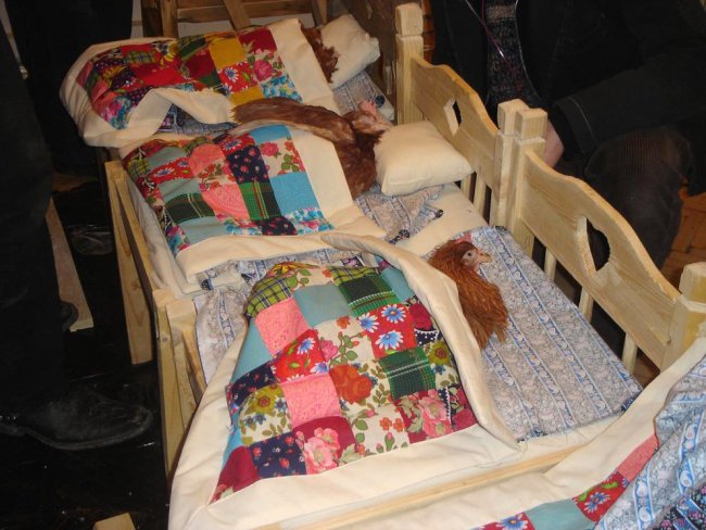 Но режиссеру требовалось, чтоб курицы не просто лежали, а спали на подушках, как люди.ъ