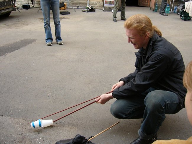 — Маленьких тараканов очень сложно приклеить к газете. Мы брали американских: они точно такие же, как наши, только размером 4–5 сантиметров. Высчитали, что оптимальное количество — четыре штуки. Если посадить шесть, один обязательно попытается тормозить. Я приклеил к четырем тараканам газету двусторонним скотчем, подул на них, с другой стороны — тепло. Тараканы побежали ровным строем с газетой.