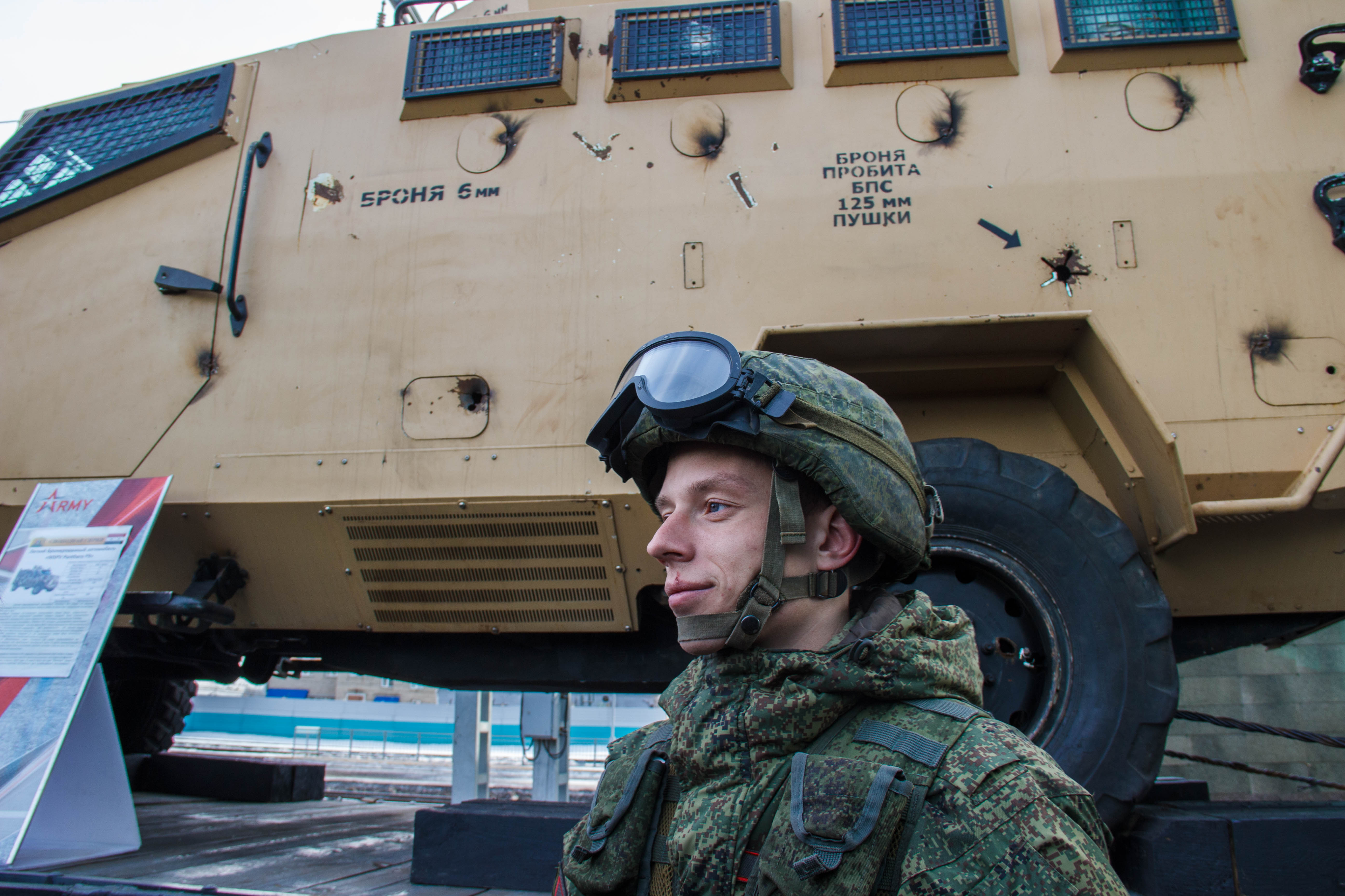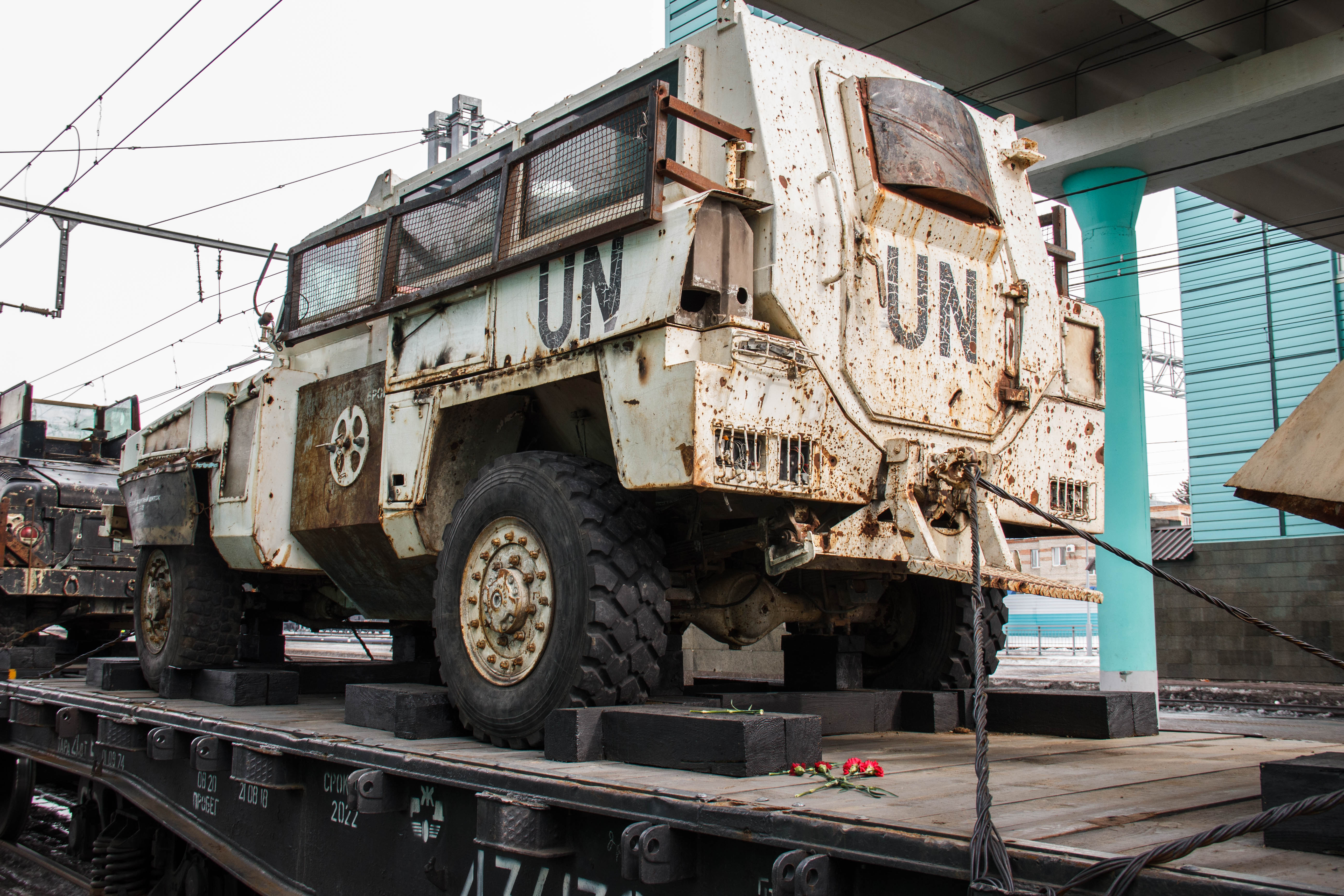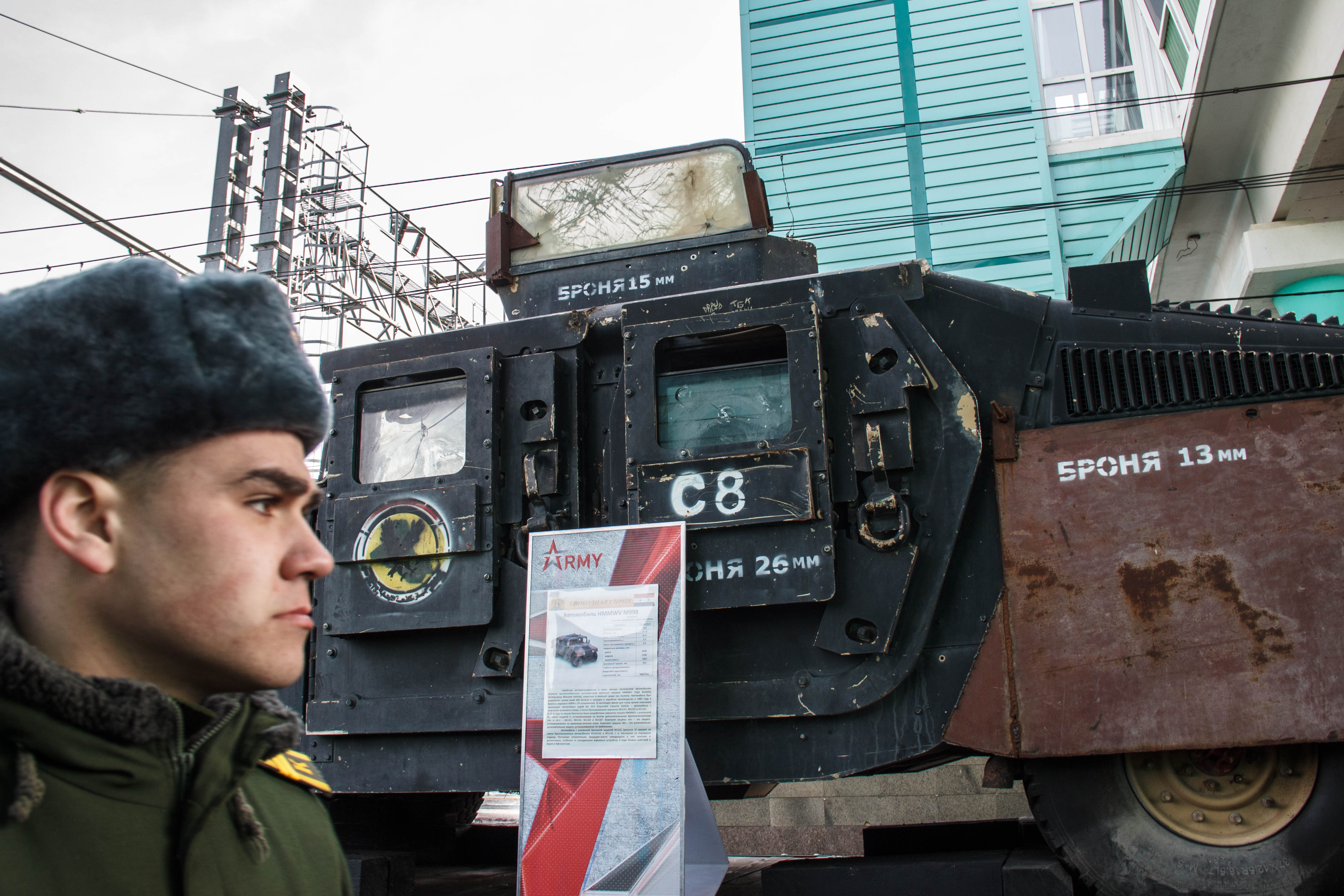 – На платформе вы видите турецкий автомобиль, предназначенный для транспортировки людей. Экипаж у него из 10 десантников и двух человек, которые управляют машиной. Броня у автомобиля – шесть миллиметров. На автомобиль можно установить пулемет 12-го калибра. Этот конкретный экземпляр был пробит сбоку танковым кумулятивным снарядом. Все, кто был внутри, сгорели заживо.