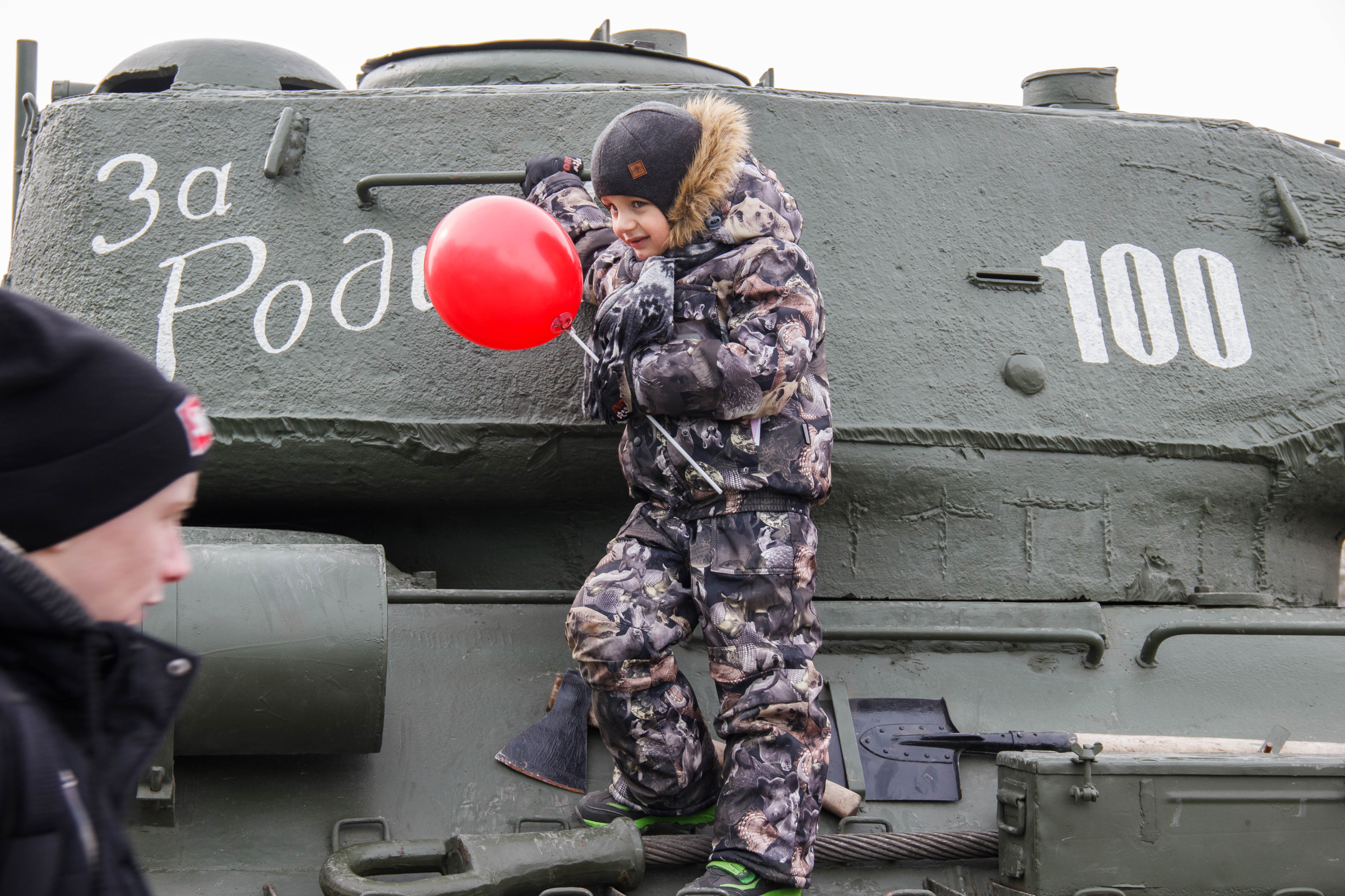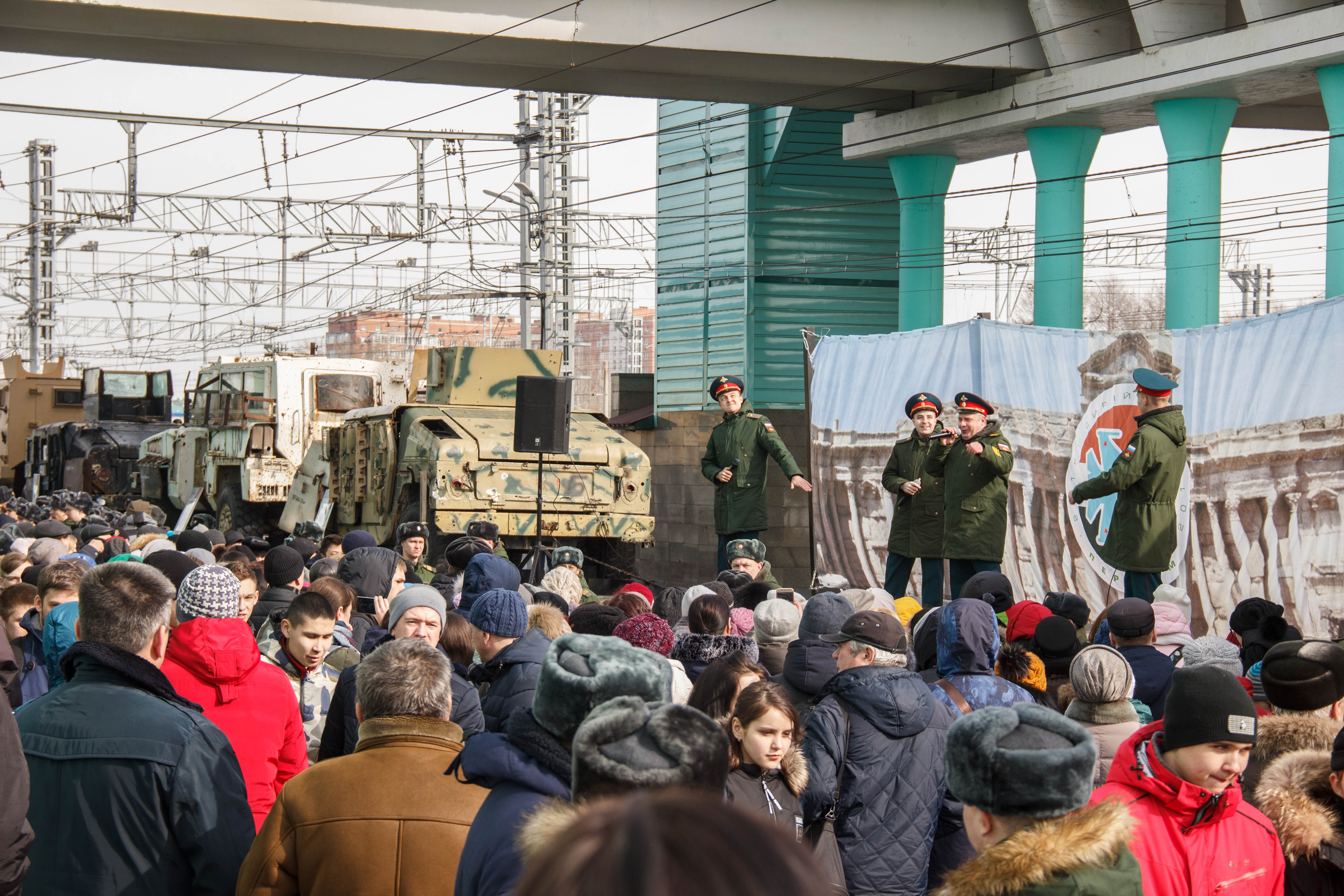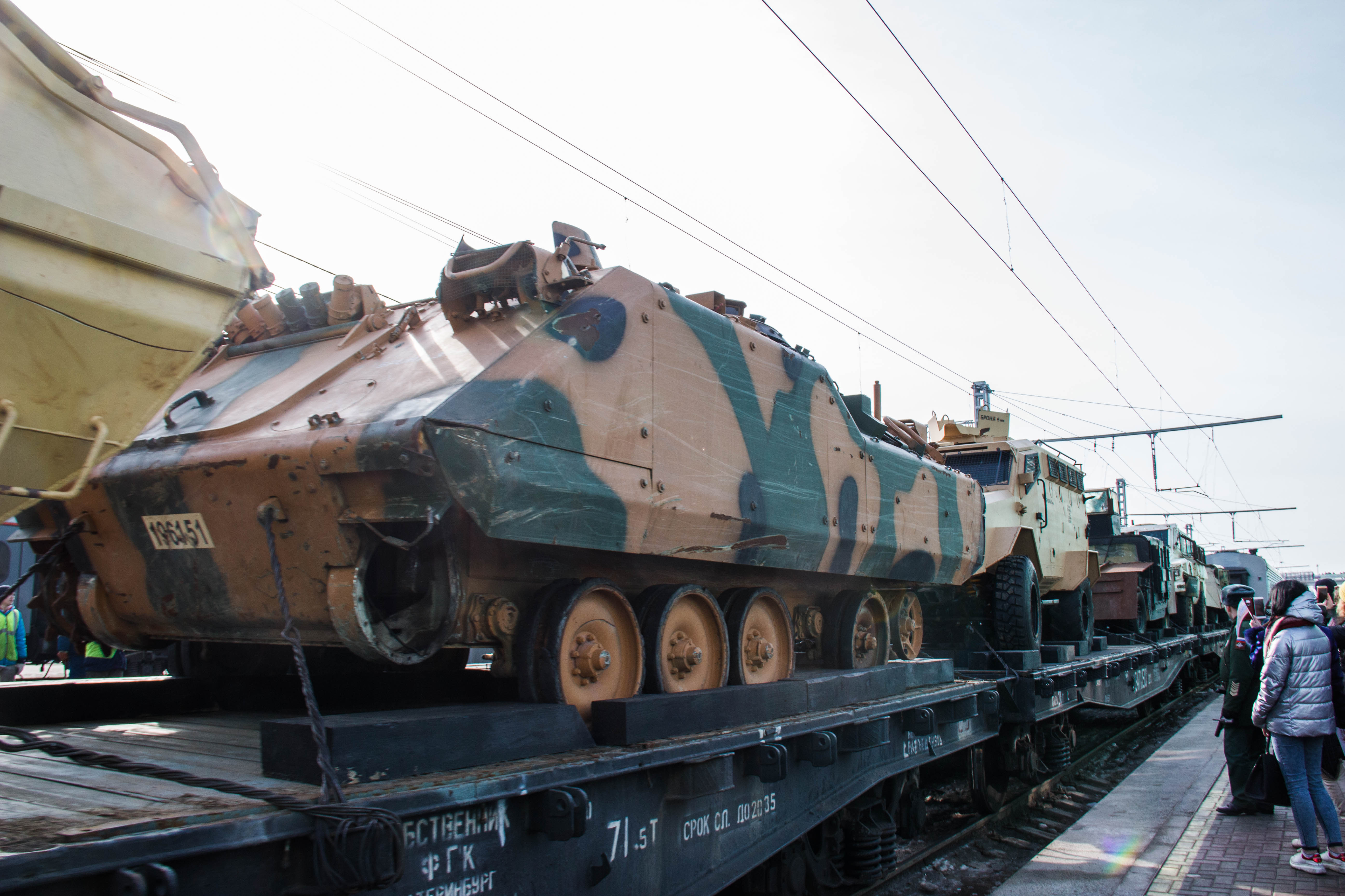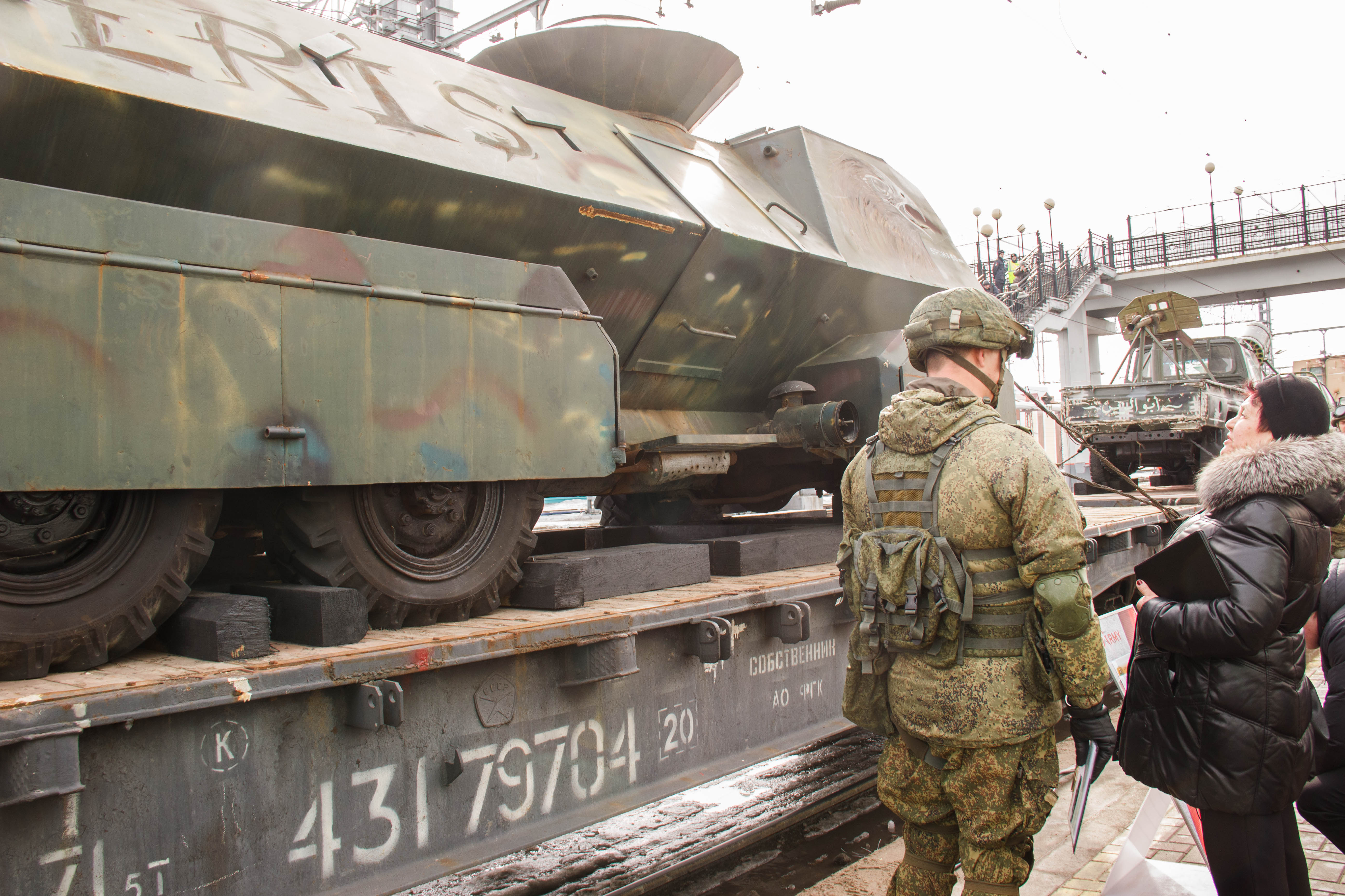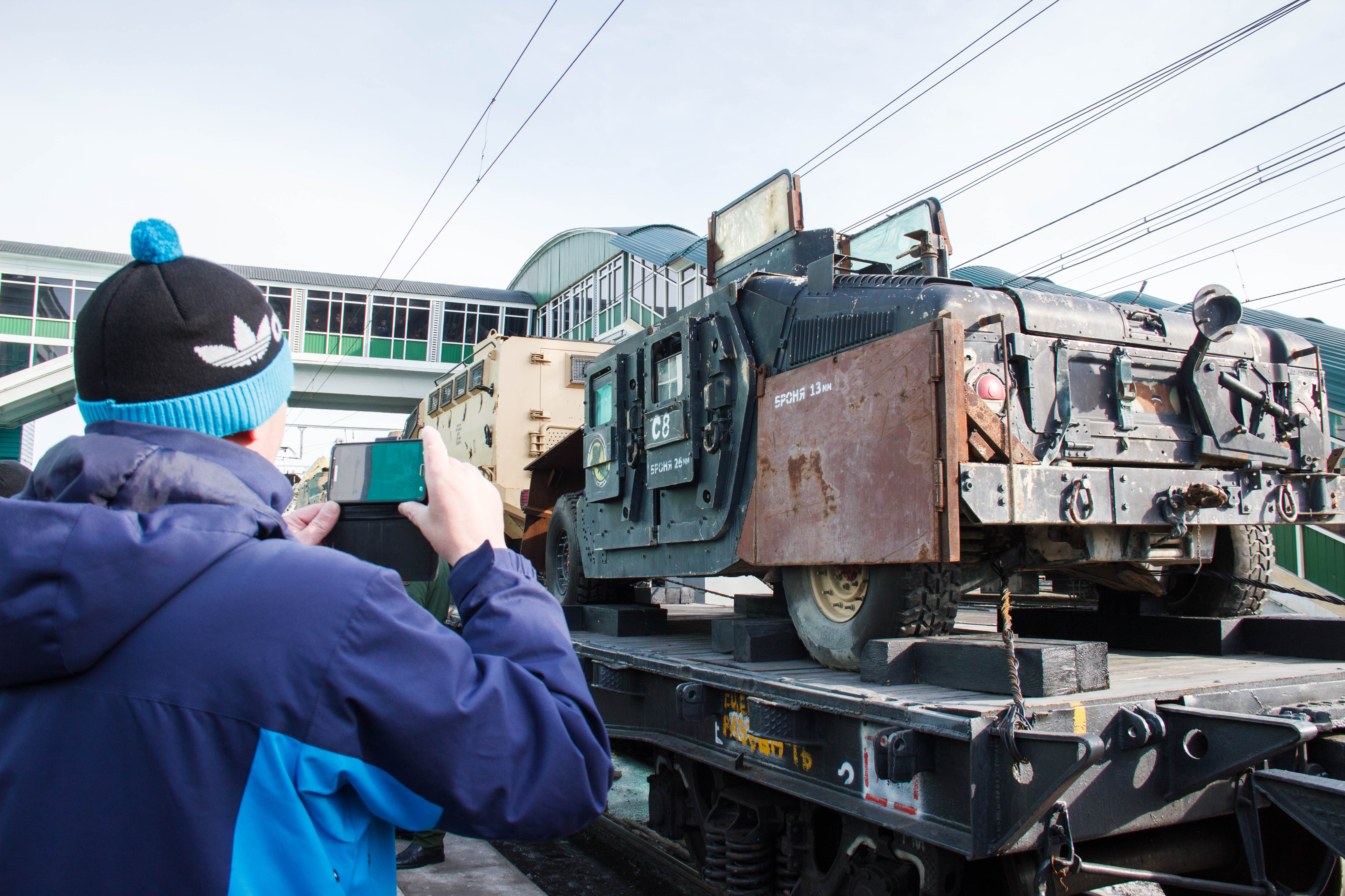 За час до прибытия эшелона с трофеями, захваченными у сирийских боевиков, на привокзальной площади уже собрался народ. Собравшихся ждал сюрприз: одна из местных воинских частей своими силами устроила небольшую экспозицию, установив рядом с вокзалом танк Т-34, бронеавтомобиль "Тигр", БТР. Дети были счастливы.
