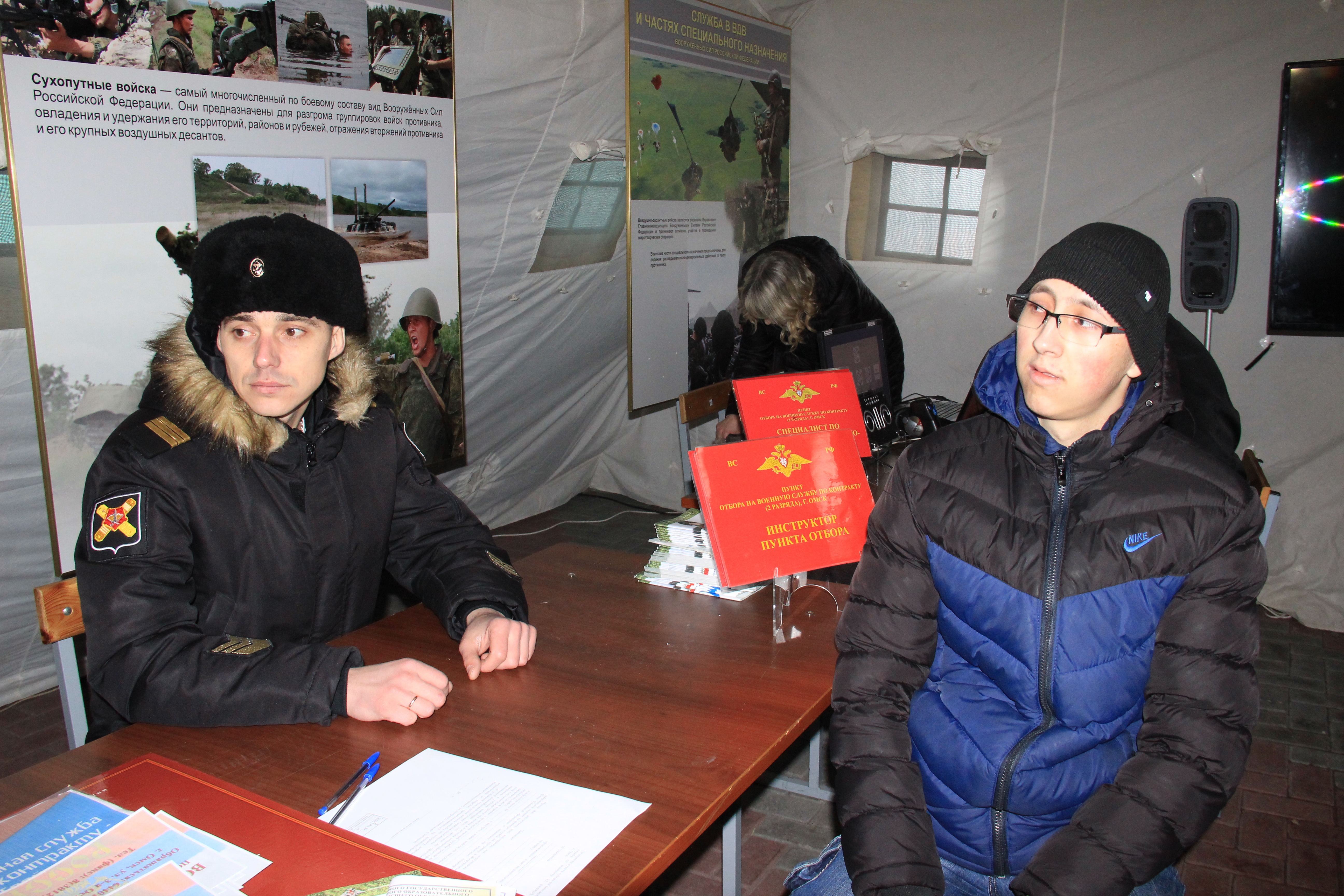 – Наш пункт посетило 785 человек на данный момент, заявления на службу по контракту написали 53 человека, – докладывает журналистам начальник пункта отбора на военную службу по контракту подполковник Эдуард Темирбулатов, приглашая посмотреть на то, как ведется работа с потенциальными контрактниками.