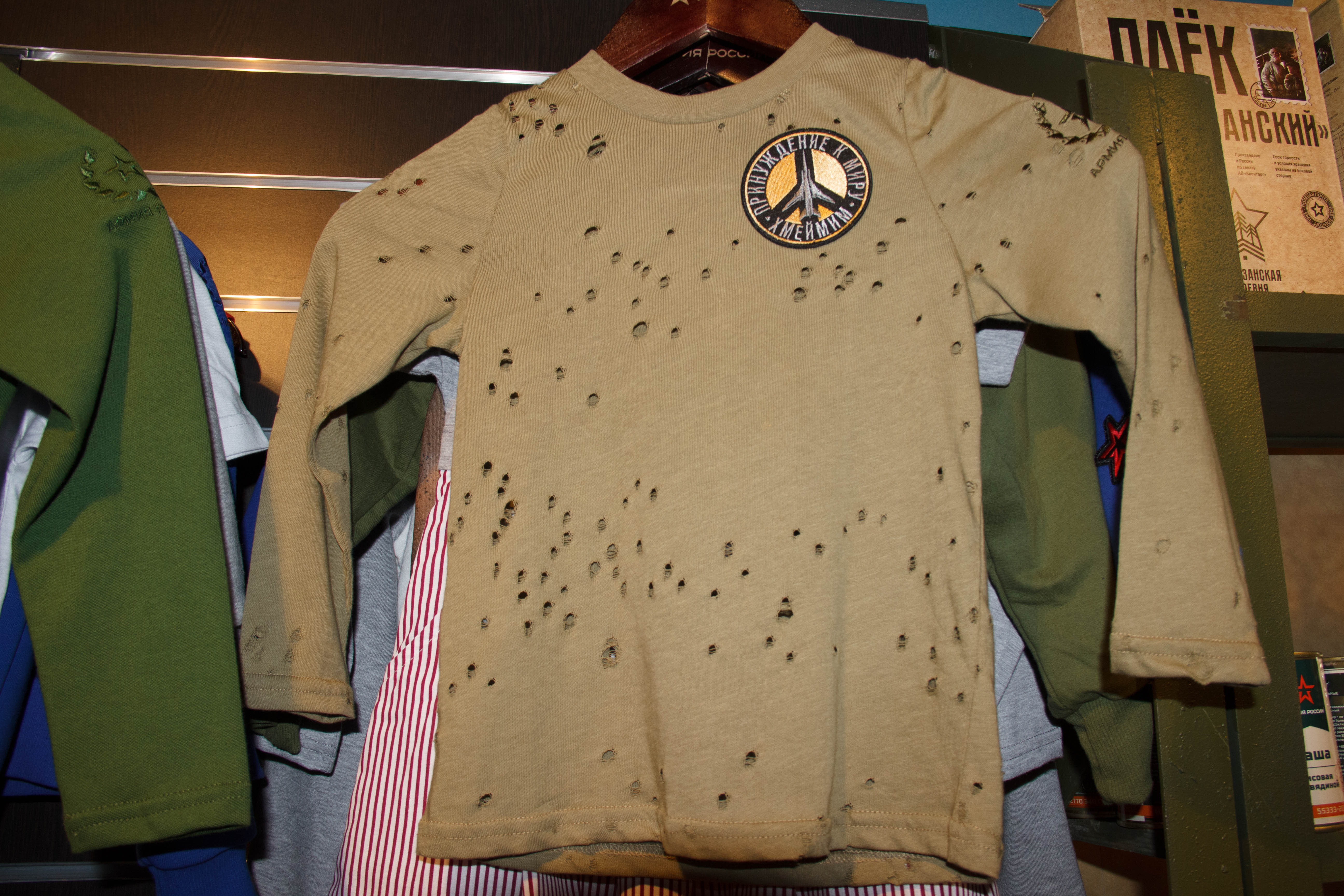 – Он самым большим спросом пользуется, – довольно сообщает продавец Антон. – У вас в Омске купили восемь футболок. Есть также в продаже и Шойгу. У него слоган другой: "Санкции МИГом исправим". Каждая такая футболка обойдется в 1200 рублей. А из детского очень стильно смотрится вот этот джемперок цвета хаки со значком "Принуждение к миру. Хмеймим".
