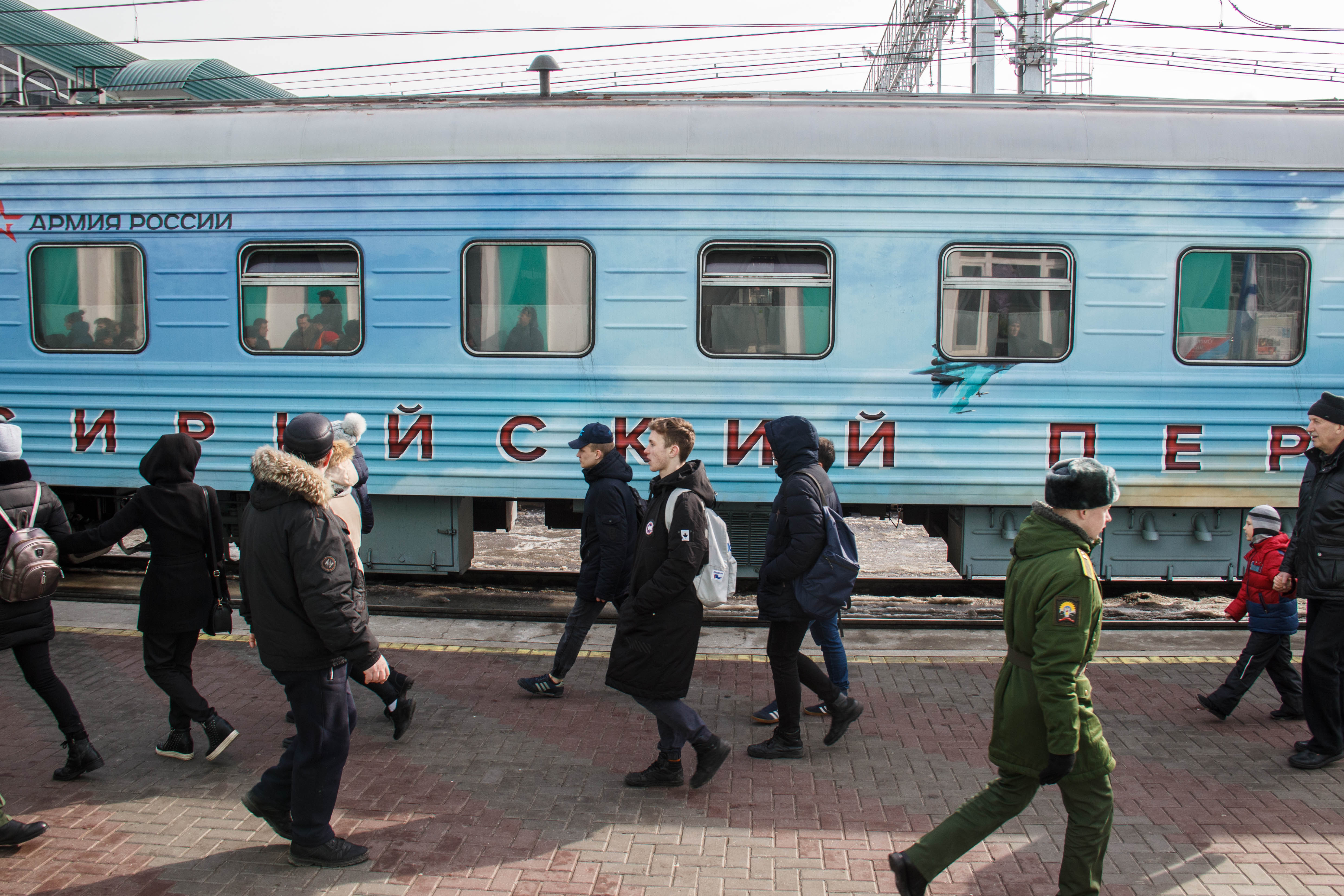 По случаю прибытия агитпоезда на перроне развернули мобильный отдел, где можно записаться на контрактную службу.