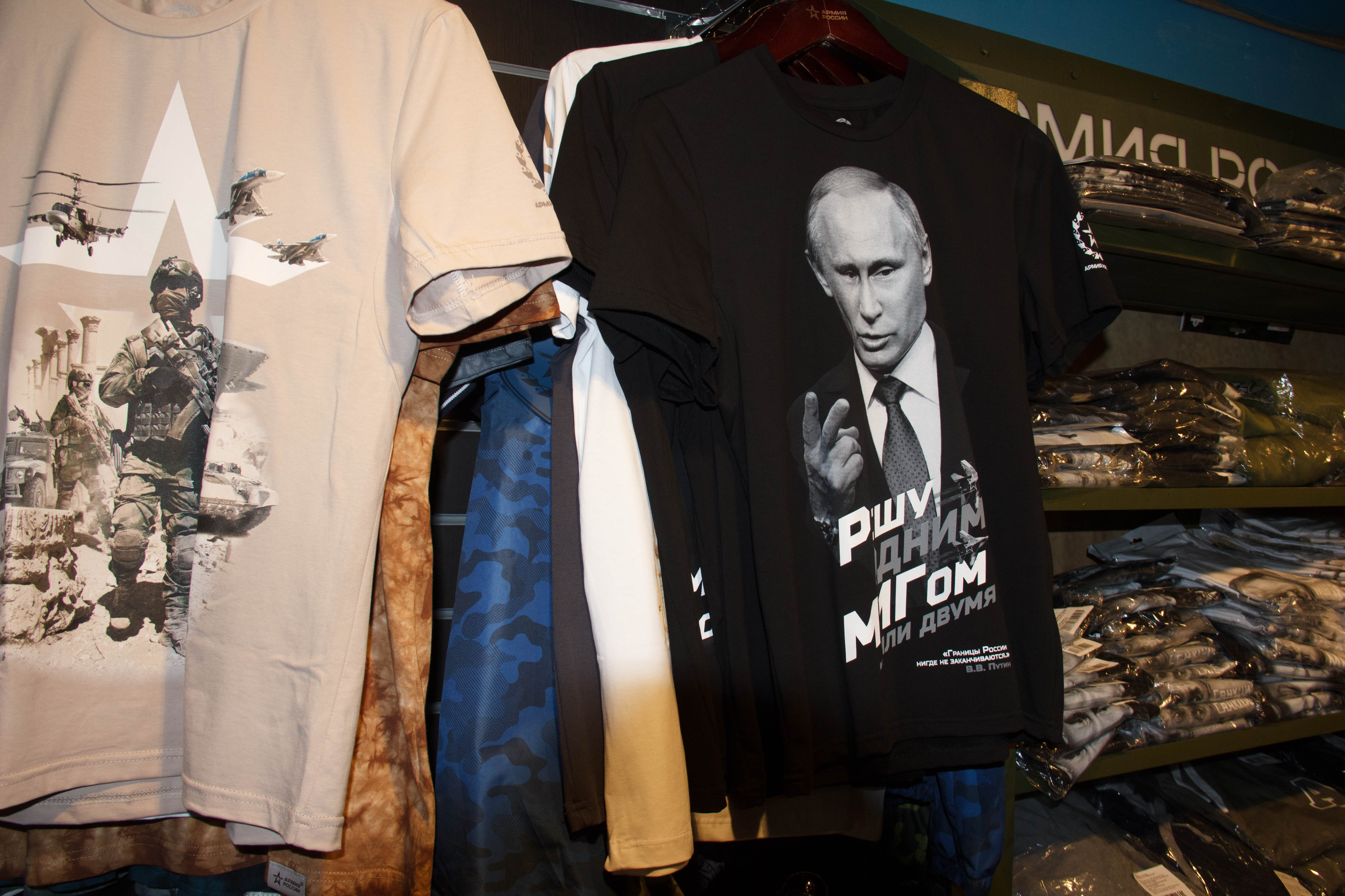 В военторге агитпоезда один из безусловных хитов – футболки с портретом Путина, со слоганом "Решу одним МИГом. Или двумя" и с цитатой президента: "Граница России нигде не заканчивается".