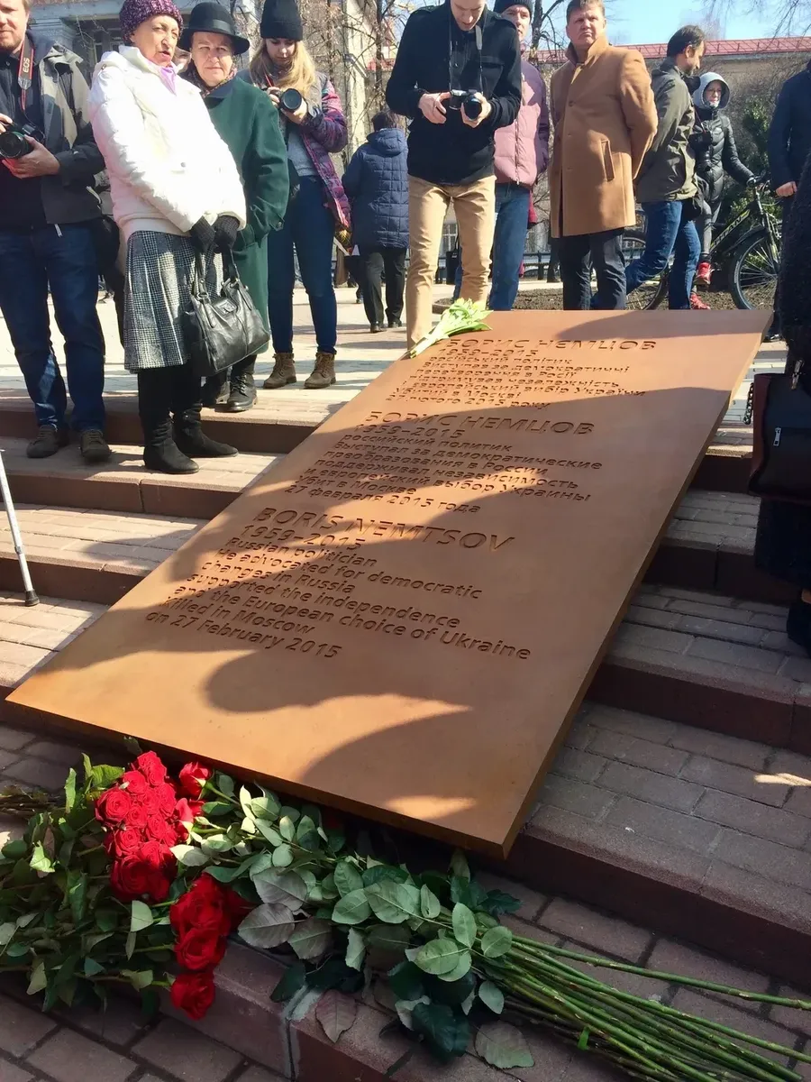 «Борис Немцов. 1959–2015. Российский политик. Выступал за демократические преобразования в России, поддерживал независимость и европейский выбор Украины. Убит в Москве 27 февраля 2015 года».