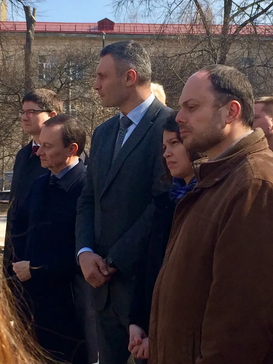 Горожан, учитывая полдень рабочего дня, собралось достаточно — событие анонсировалось в СМИ. Много телекамер. Мэр Киева Виталий Кличко и Жанна Немцова снимают с мемориальной плиты покрывало. Они подошли сюда пешком. До того Кличко показал гостям из «Свободной России» и Фонда Бориса Немцова другую экспозицию. На газоне возле посольской ограды будто мольберты расставлены — фамилии, фотографии украинских военных моряков, находящихся в «Лефортово», требования их освободить. Посольство РФ производит впечатление необитаемой крепости.