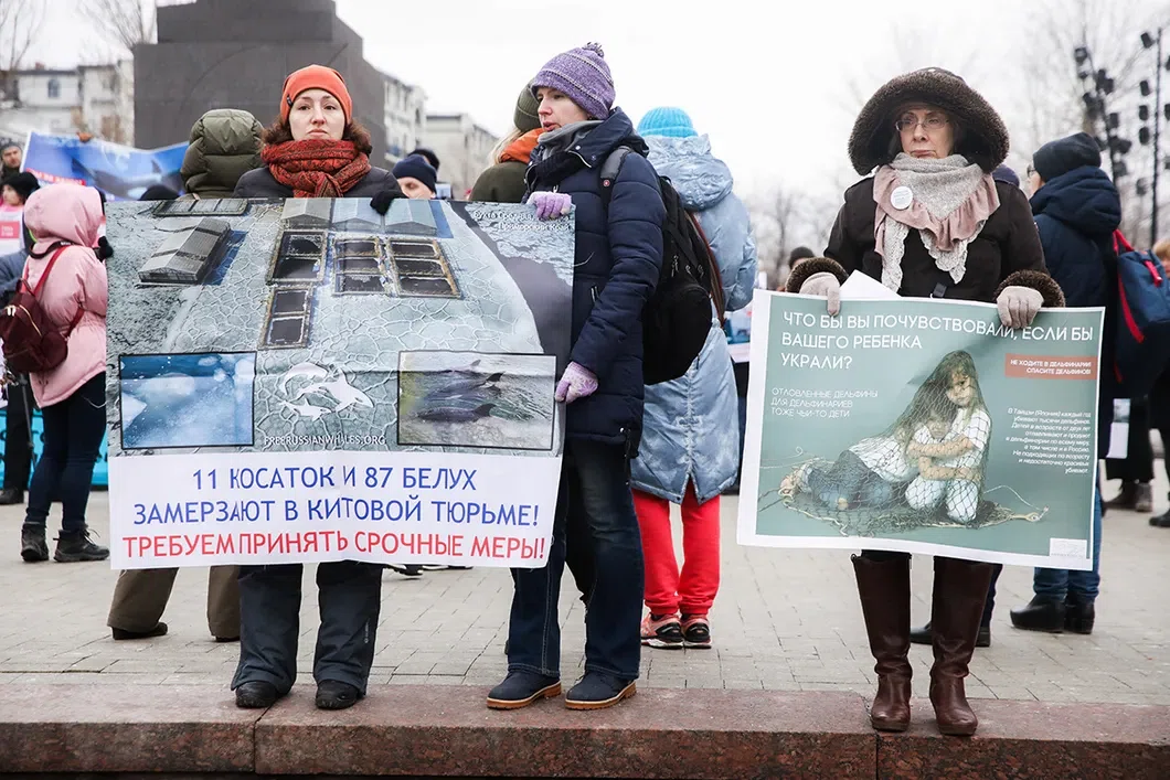 «Люди приходили с разными плакатами и лозунгами: кто-то призывал отстранить организации ВНИРО и ТИНРО от координации комиссии по освобождению косаток и белух, многие призывали голосовать на сайте «Российской общественной инициативы» за запрет отлова китообразных в научных и развлекательных целях. В этот раз у нас не замечено ни одного провокатора, хотя на прошлой акции их было около 60 человек», — рассказал он.