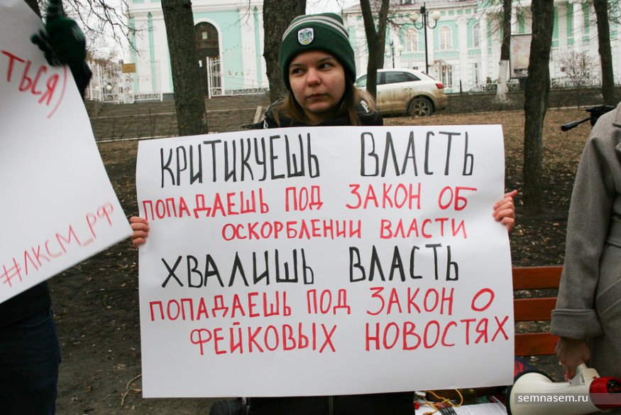 Депутаты Госдумы 7 марта приняли новые законопроекты о наказаниях за «оскорбление общества и государства» и распространение заведомо ложных или фейковых новостей. «Явное неуважение» будет наказываться штрафом от 30 до 100 тыс. руб., а оскорбительная информация «незамедлительно» удаляться. Вторая инициатива предполагает возможную блокировку сайтов при обнаружении на них недостоверной, по мнению Генпрокуратуры, информации и штрафы до 500 тыс. рублей.