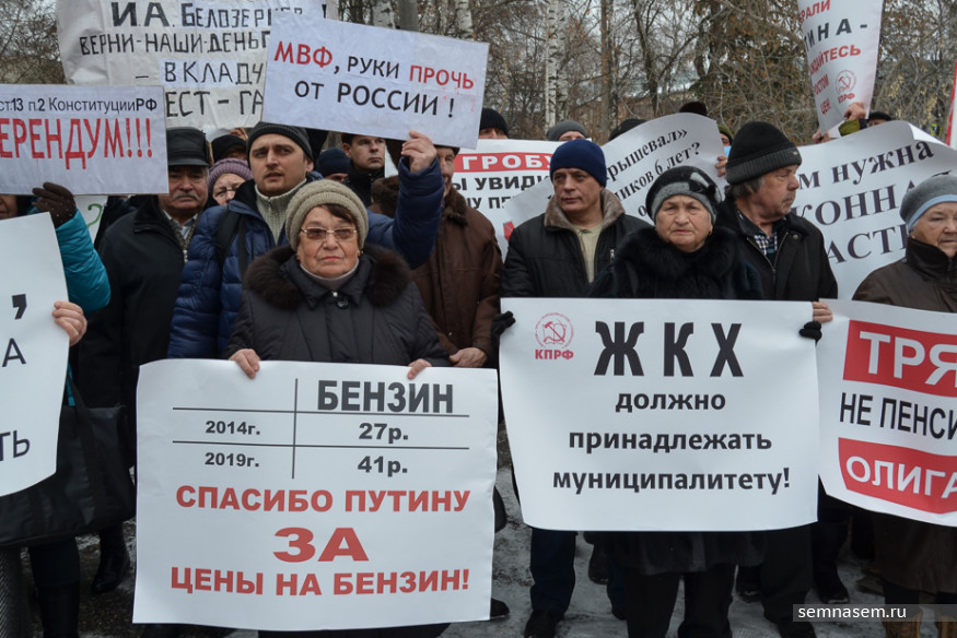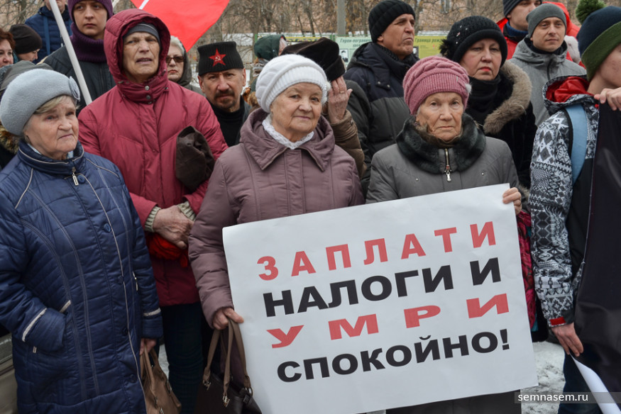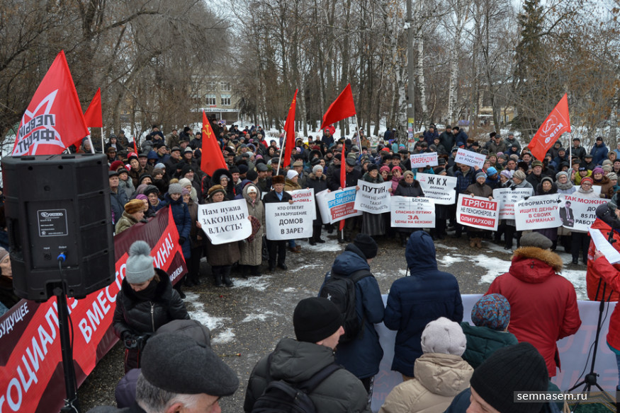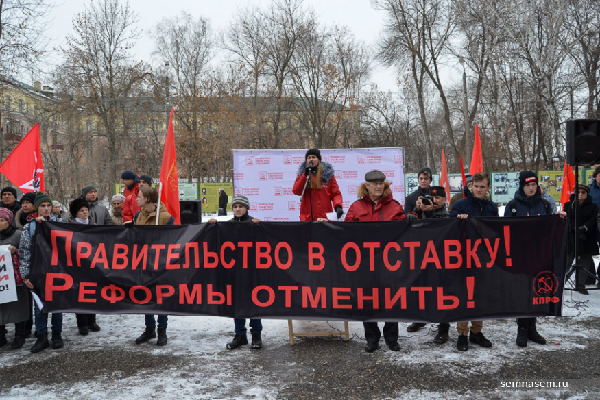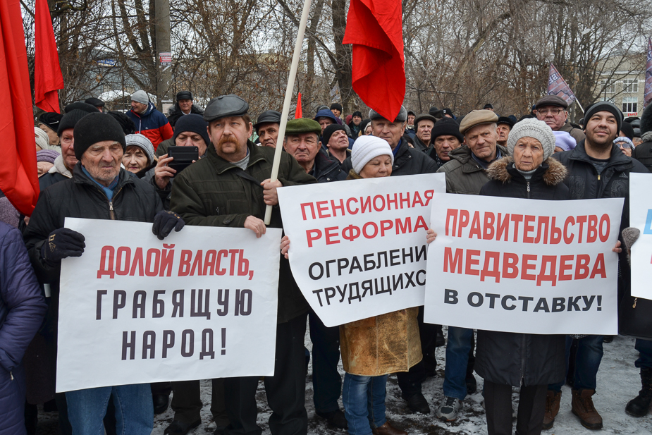 Участники митинга держали в руках транспарант «Правительство в отставку! Реформы отменить!». Он перекликался по смыслу с растяжкой «Долой власть, грабящую народ!».