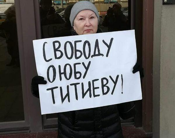 Днем в понедельник, пока судья Зайнетдинова зачитывала приговор, в Москве у входа в администрацию президента группа гражданских активистов провела одиночные пикеты с плакатом "Свободу Оюбу Титиеву!".