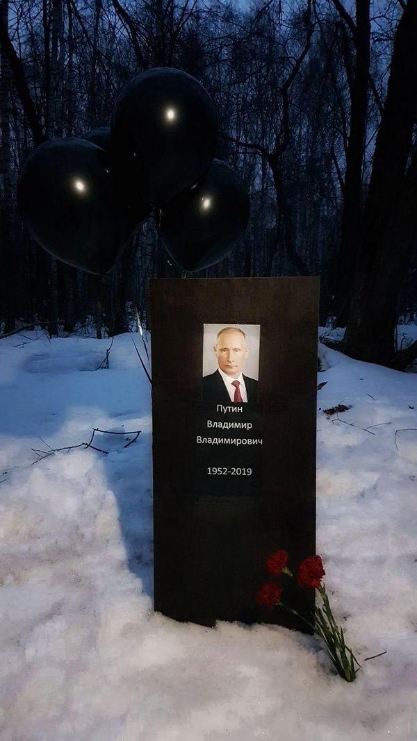 В Москве активисты "бессрочного протеста" установили могильный памятник Владимиру Путину. Об этом сообщается в телеграм-канале "Бессрочка | Москва".