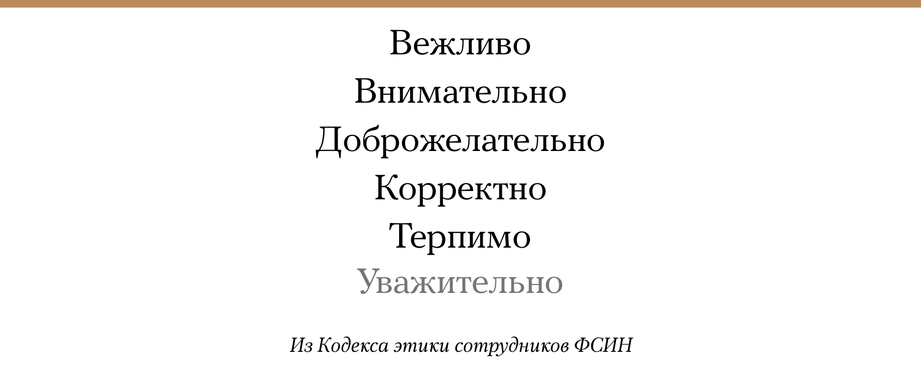 Федеральная служба исполнения наказаний подготовила поправки в кодекс этики для своих сотрудников. Теперь в нем пропишут порядок извинений перед гражданами в случае нарушения прав и свобод. Также «в обращении» с гражданами (заключенными) и коллегами сотрудники ФСИН должны будут дополнительно проявлять уважение и вежливость. При этом вежливость уже является рекомендованным качеством «в общении» с гражданами и коллегами. Чем отличаются правила поведения «в общении» и «в обращении», в кодексе не сказано. Уважение (в общении или обращении) в действующей редакции кодекса никак не прописано.