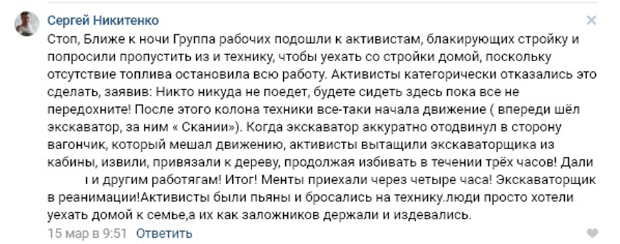 На следующий день под сообщениями о столкновении в соцсетях стали появляться комментарии от разных людей с одним и тем же текстом о том, что это противники строительства полигона избили Алексея Козлова и сломали ему позвоночник. «Экскаваторщик в реанимации! Активисты были пьяны и бросались на технику», — утверждалось в тексте. Характерно, что большинство аккаунтов, чьи владельцы оставляли эти комментарии, оказались липовыми. На сайте «Эхо Севера» появилось даже сообщение о том, что активисты закидали экскаватор «коктейлями Молотова».