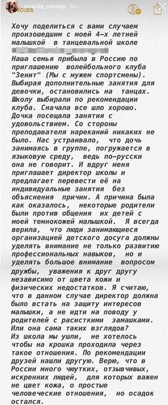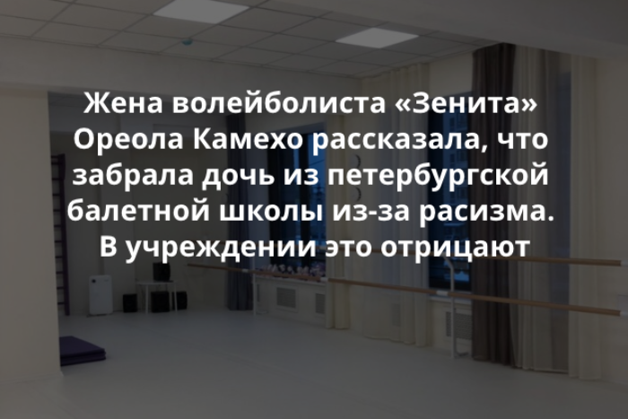 Жена игрока волейбольного клуба «Зенит» Ореола Камехо, Присцилла Камехо, рассказала, что забрала из частной балетной школы дочку из-за расистского отношения.