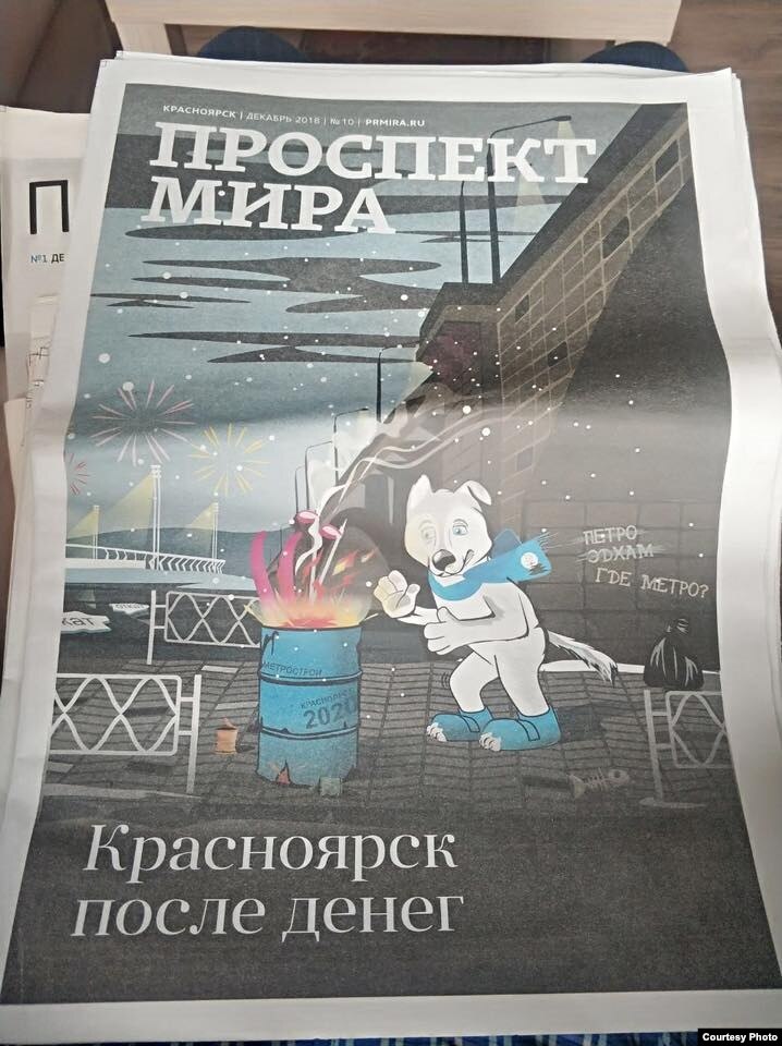 Красноярскому изданию "Проспект мира" пришла жалоба на неправомерное использование товарного знака Универсиады-2019. Об этом редакции "Сибирь.Реалии" сообщил руководитель проекта Илья Лабунский. В декабре 2018 года вышел шуточный номер с карикатурной обложкой на предстоящие спортивные игры.